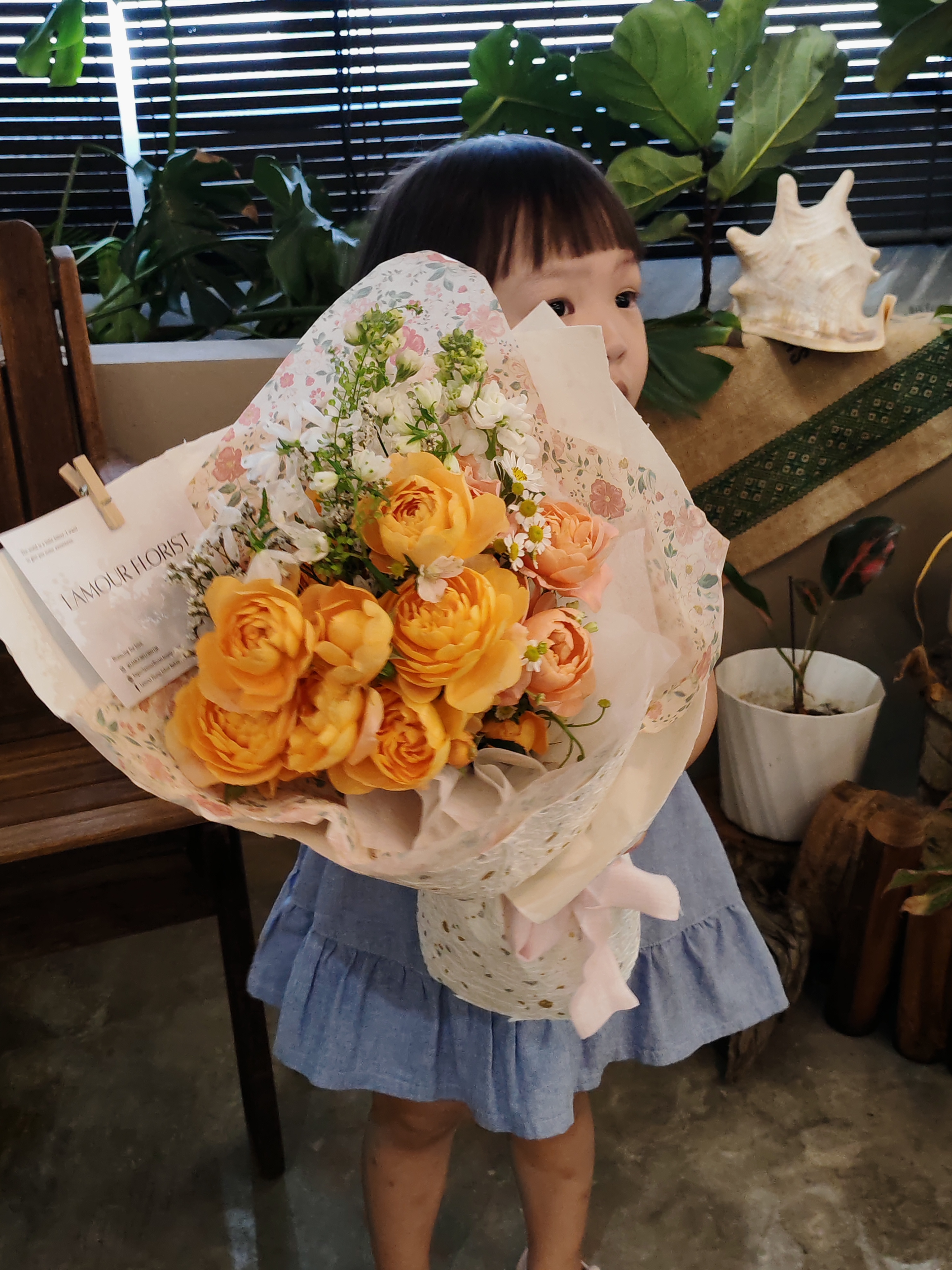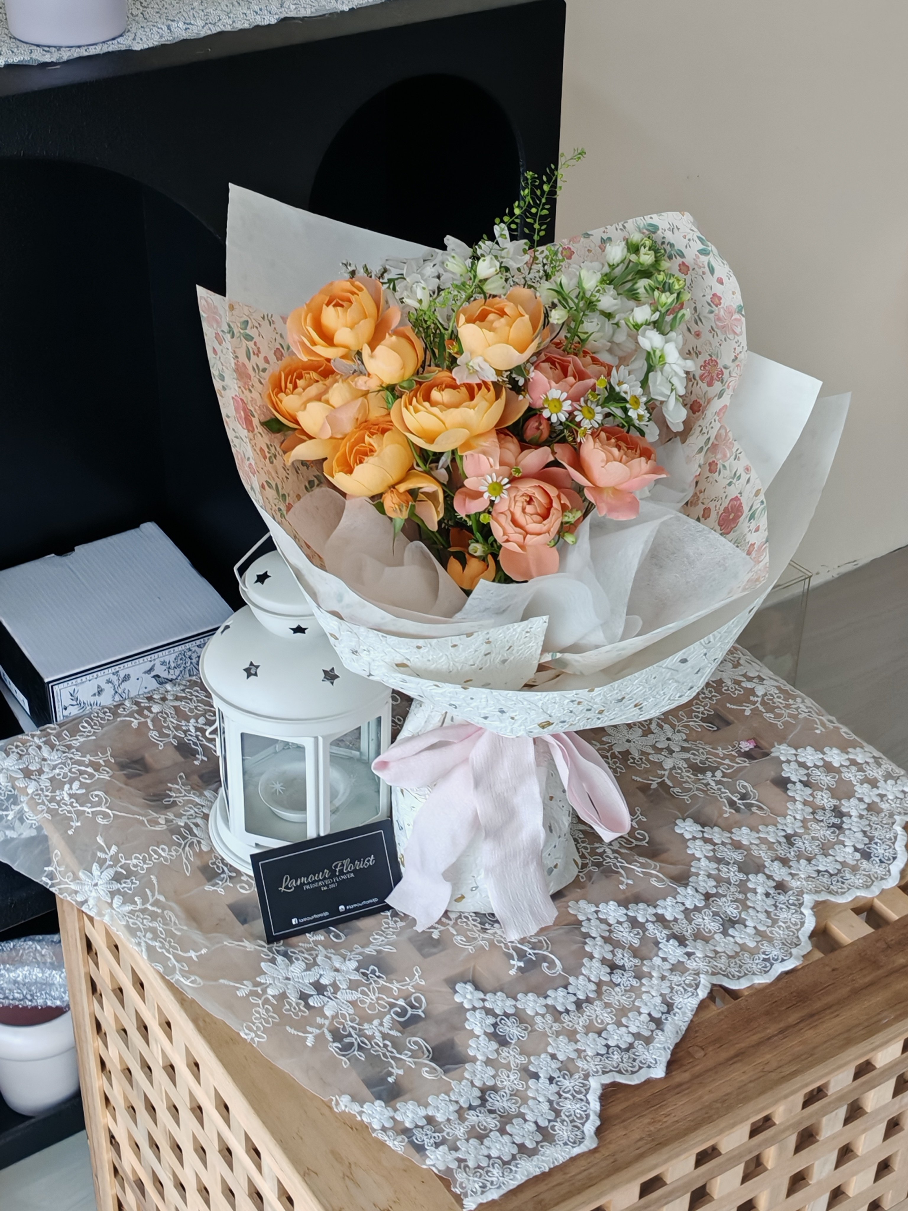 MAIN FLOWERS Rose spray Apricot Juice Terrace, Mathiola, hana, chamomile, penicum and thalaspi green bell. SIZE: Small Bouquet Approx. 30cm*32cm COMES WITH Free greeting card and transparent gift bag. PRE-ORDER Pre-order 3- 5 days. DELIVERY AREA JB area delivery service available.