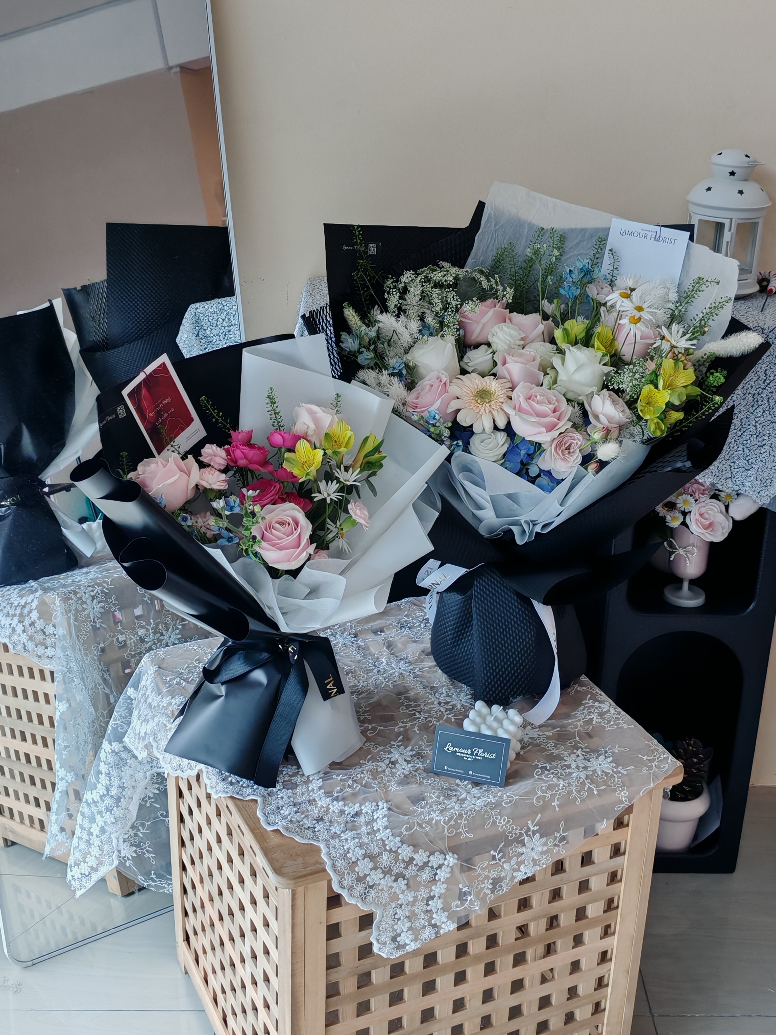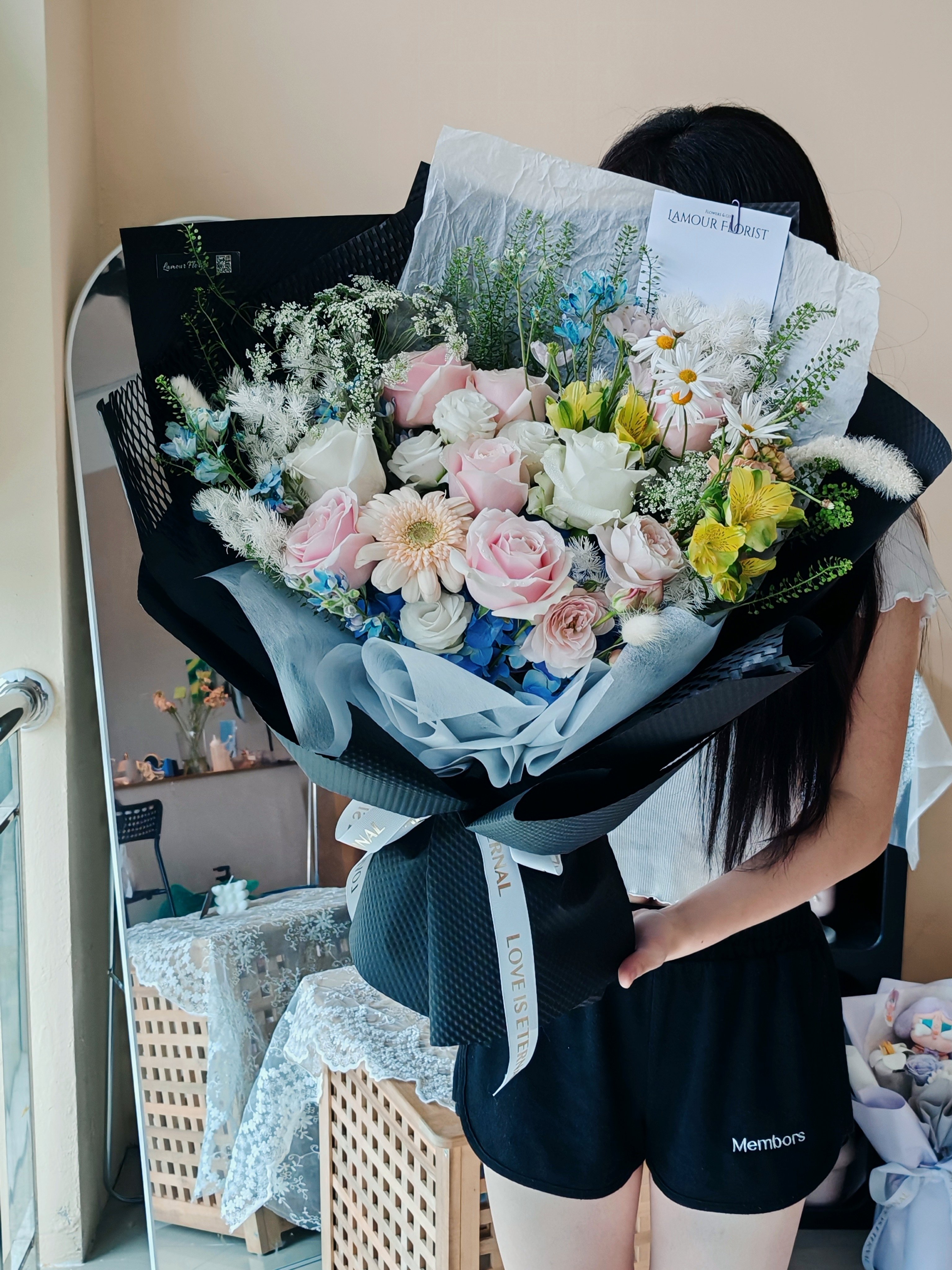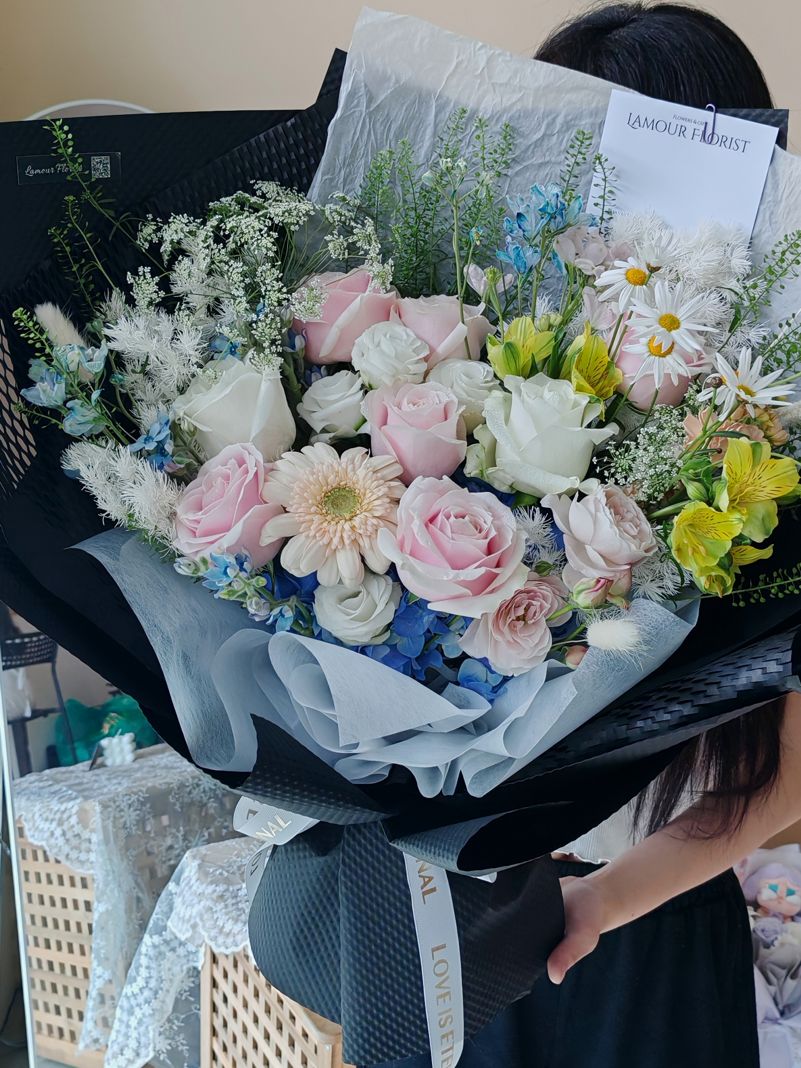 Import fresh pink rose, white rose, eustoma, ammi majus, astromeria, mini delphinium, hydrangea, spray rose, preserved asparagus, oxypetalum, leacathemum and green leaf.