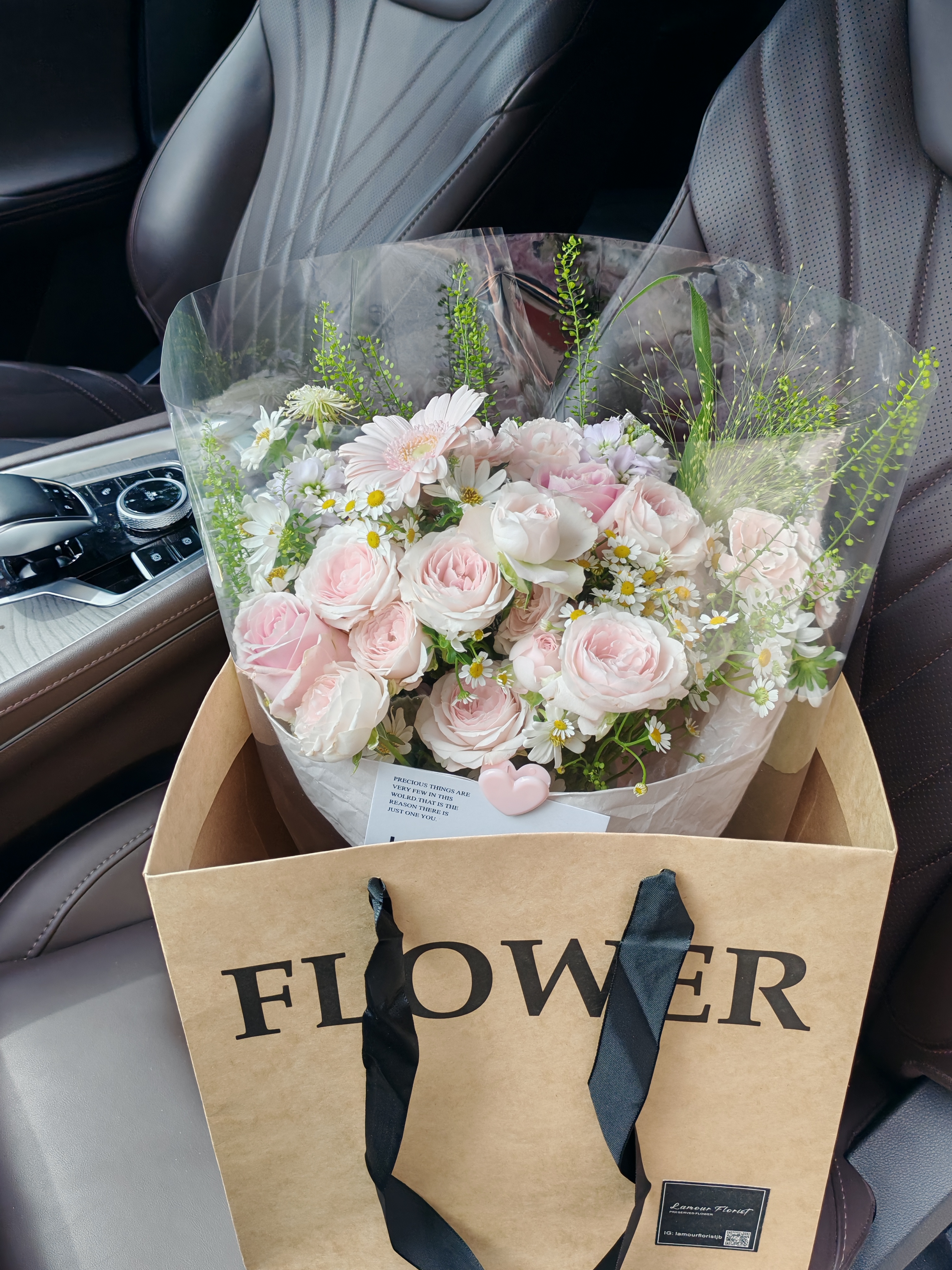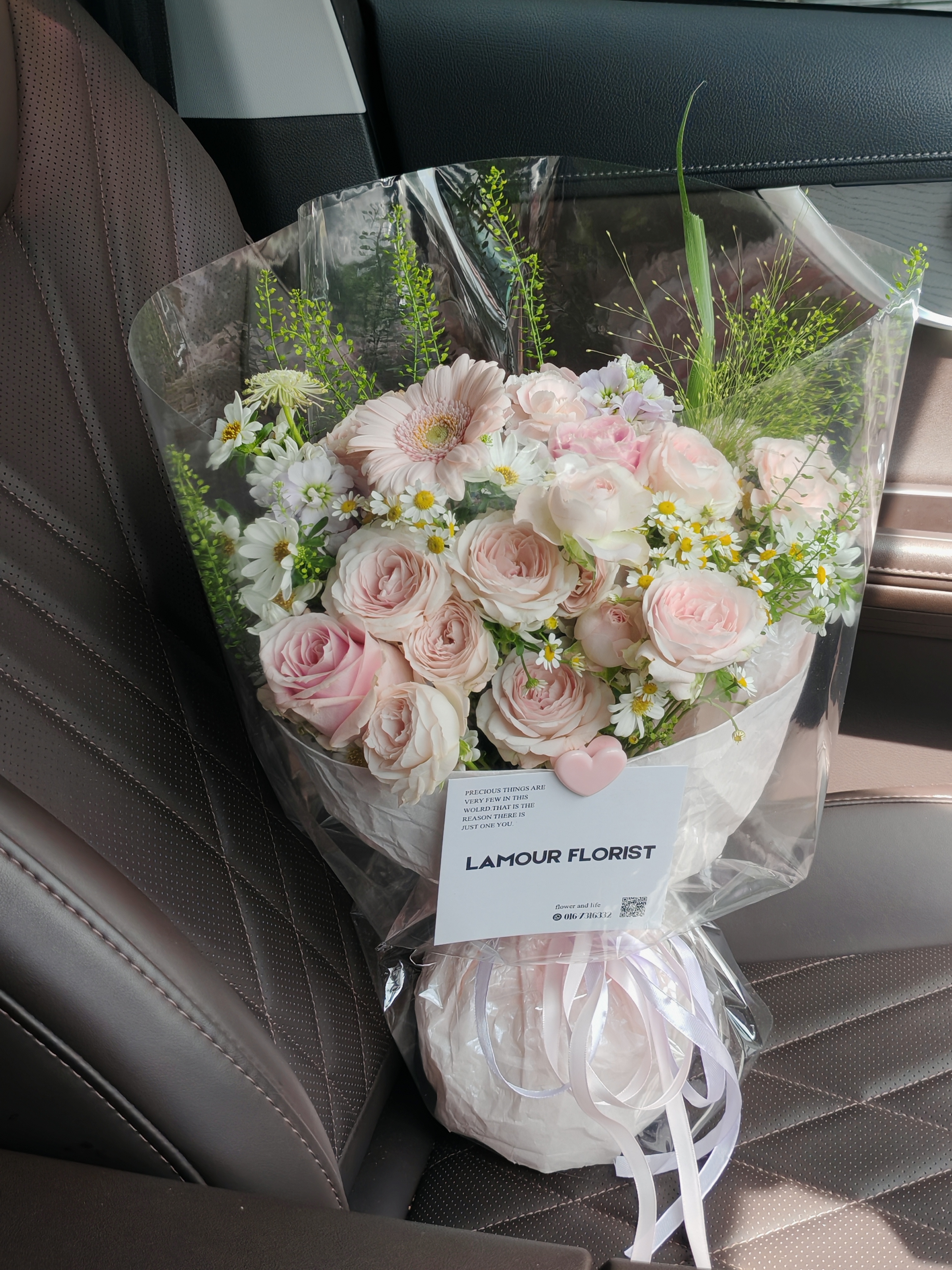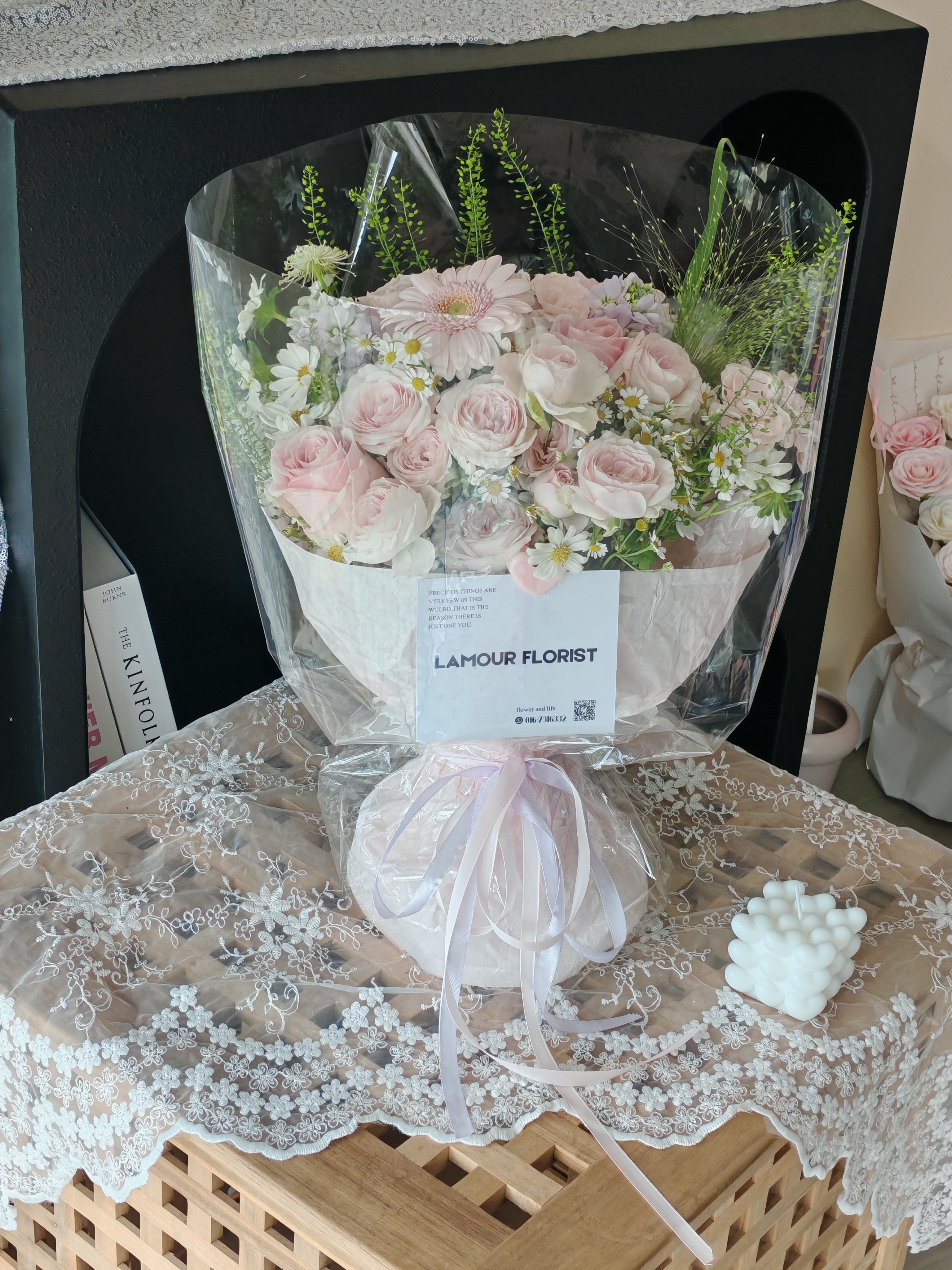 MAIN FLOWERS Kiss of Fairy spray rose, gerbera, chamomile, oxypetalum, panicum tracymene and thalaspi green bell. PRODUCT LIFESPAN 2 - 4 days with proper care needed. SIZE Approx 33cm*40cm FREE PRINTED MESSAGES CARD for each Bouquet purchase. JB area delivery service available