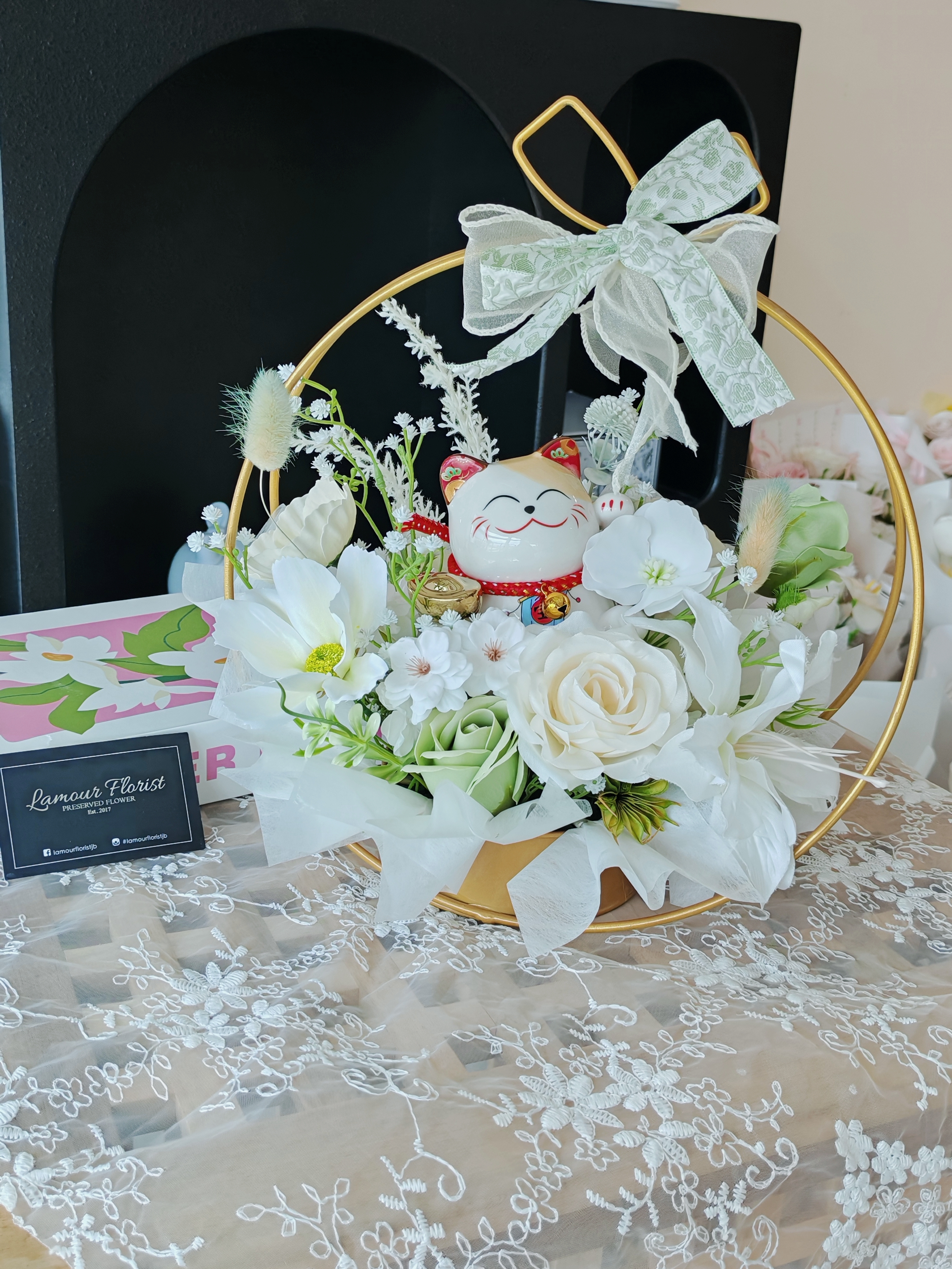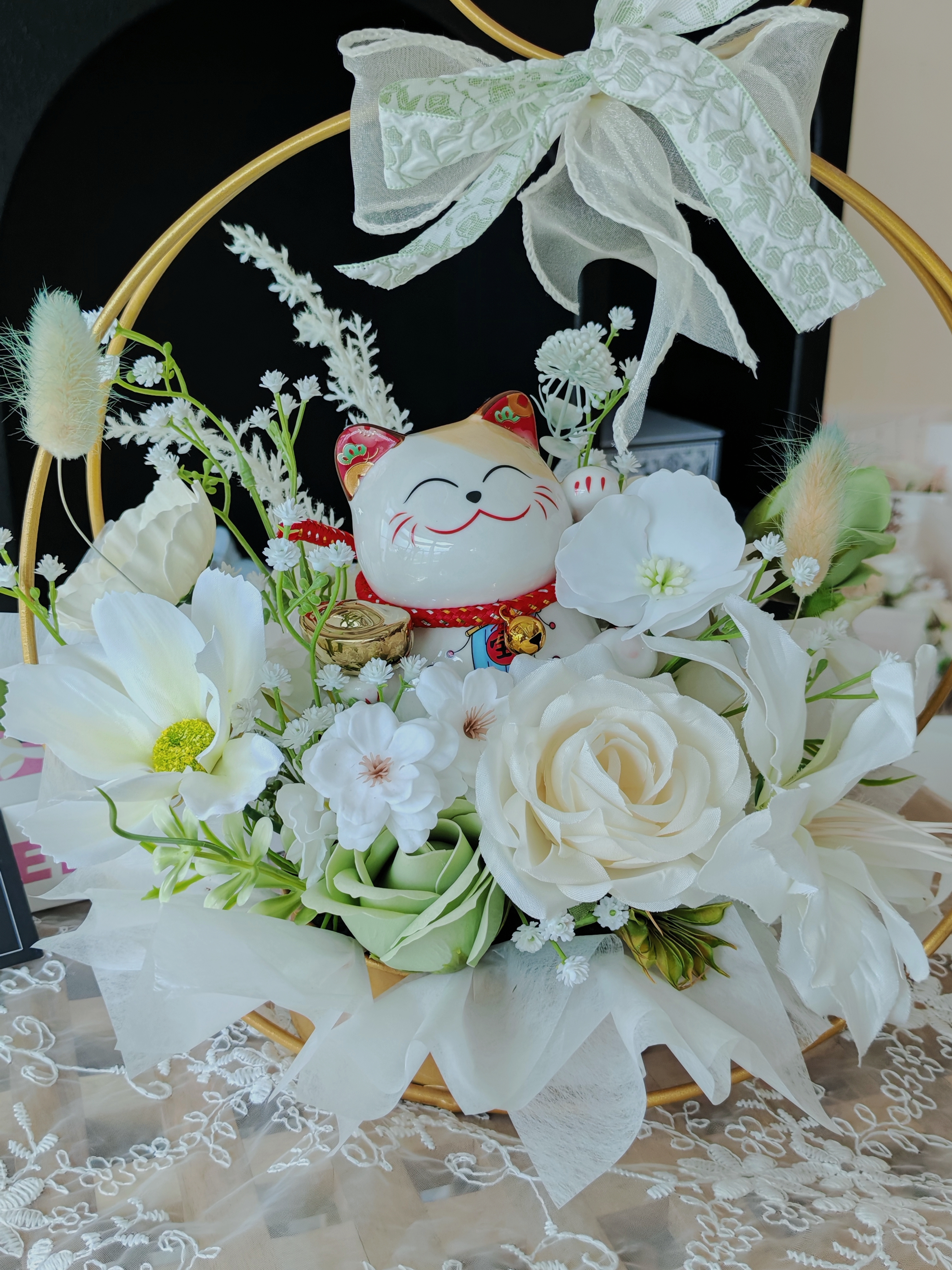 Lucky Cat Grand Opening Flower Decoration. Featuring mixed of soapflower rose and artificial flowers. Size: Approx. 30 x 30cm Ready Stock available for last-minute purchase. Free delivery for JB area.