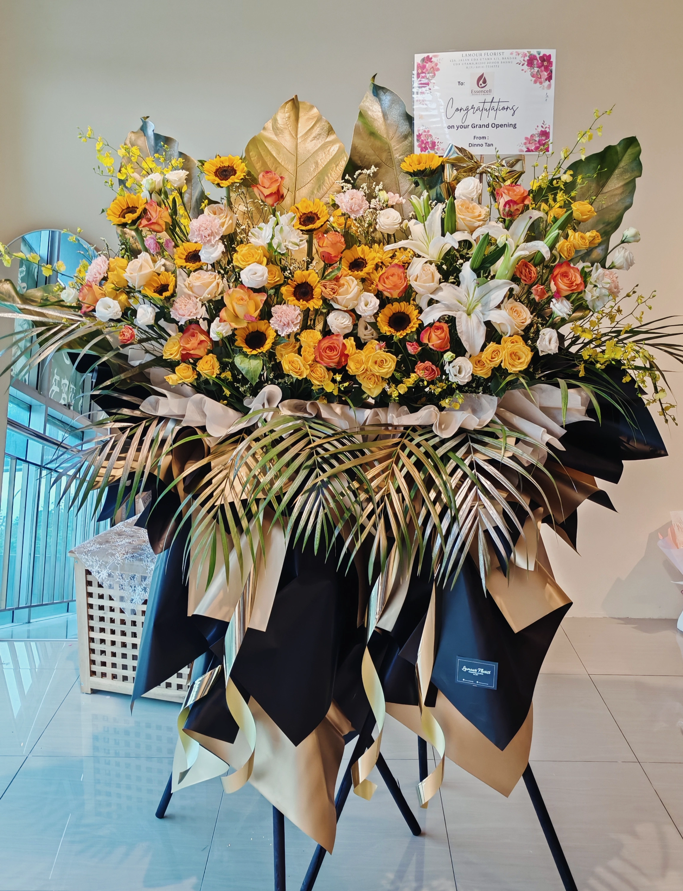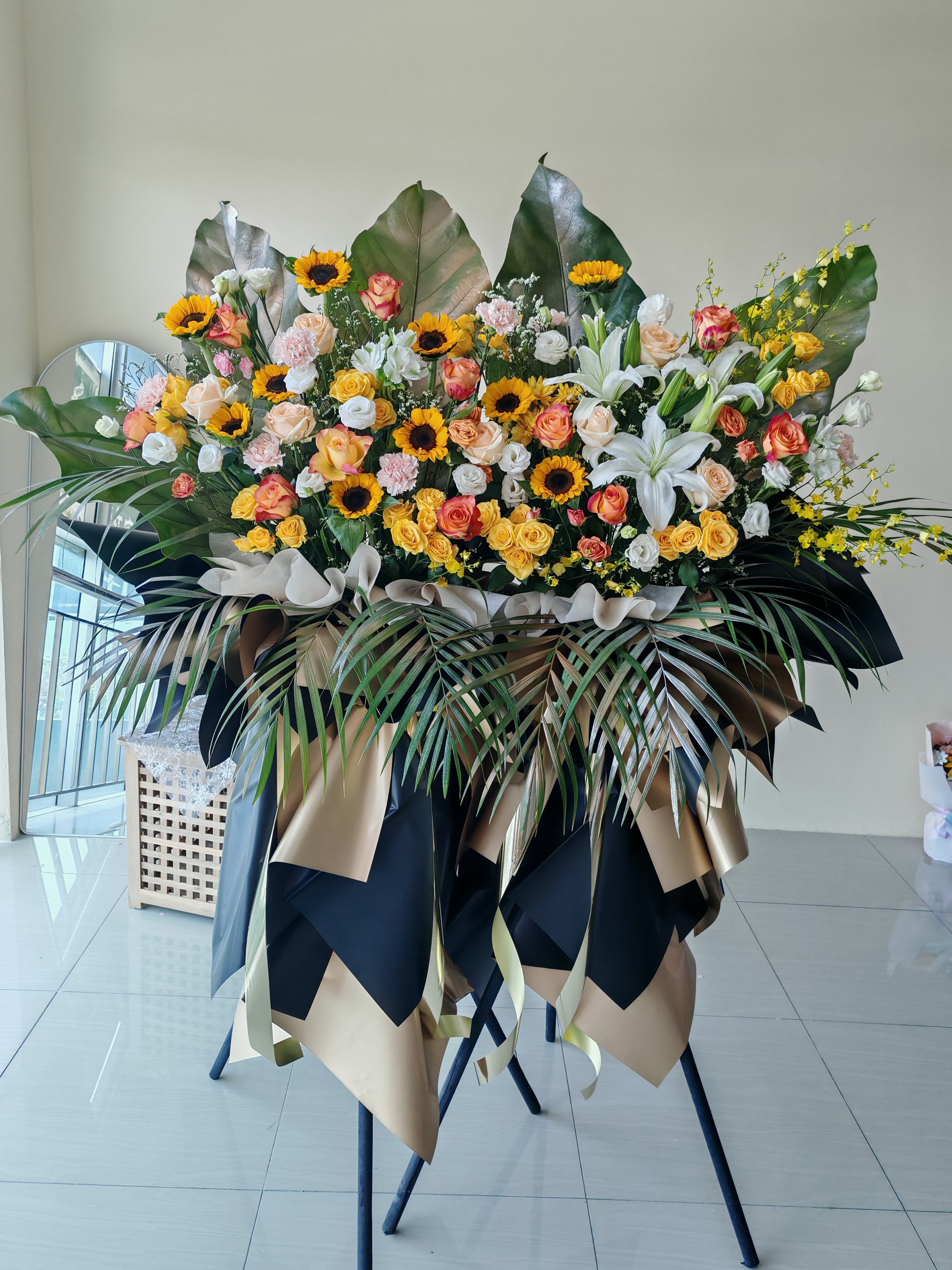 MAIN FLOWERS Sunflowers, roses, eustoma, spray rose, Lily, Jungle bush, dancing lady and yellow palm leaf. PRODUCT LIFESPAN 2-3 days with proper care needed. SIZE Combine 2 set flower stand into one.