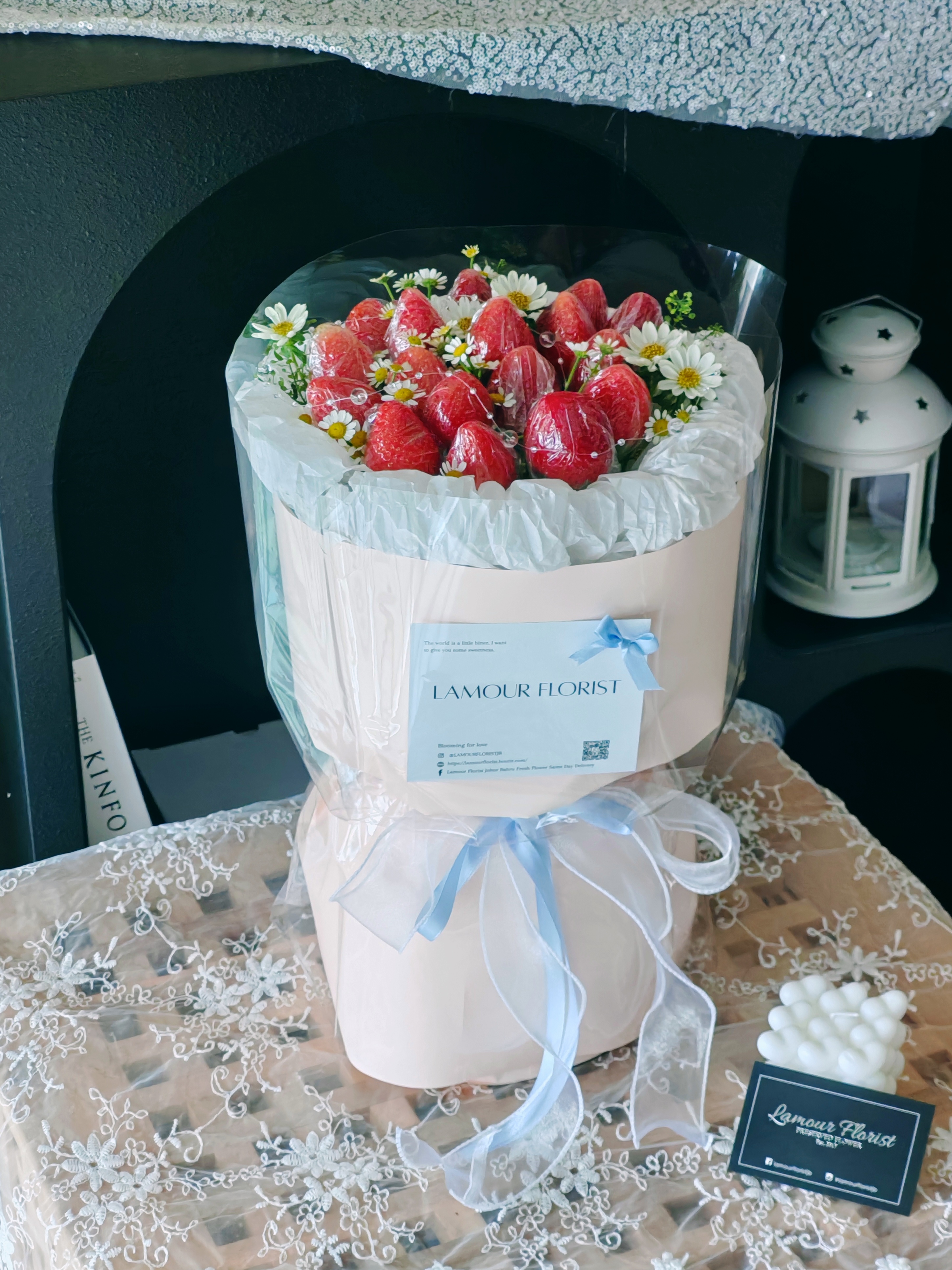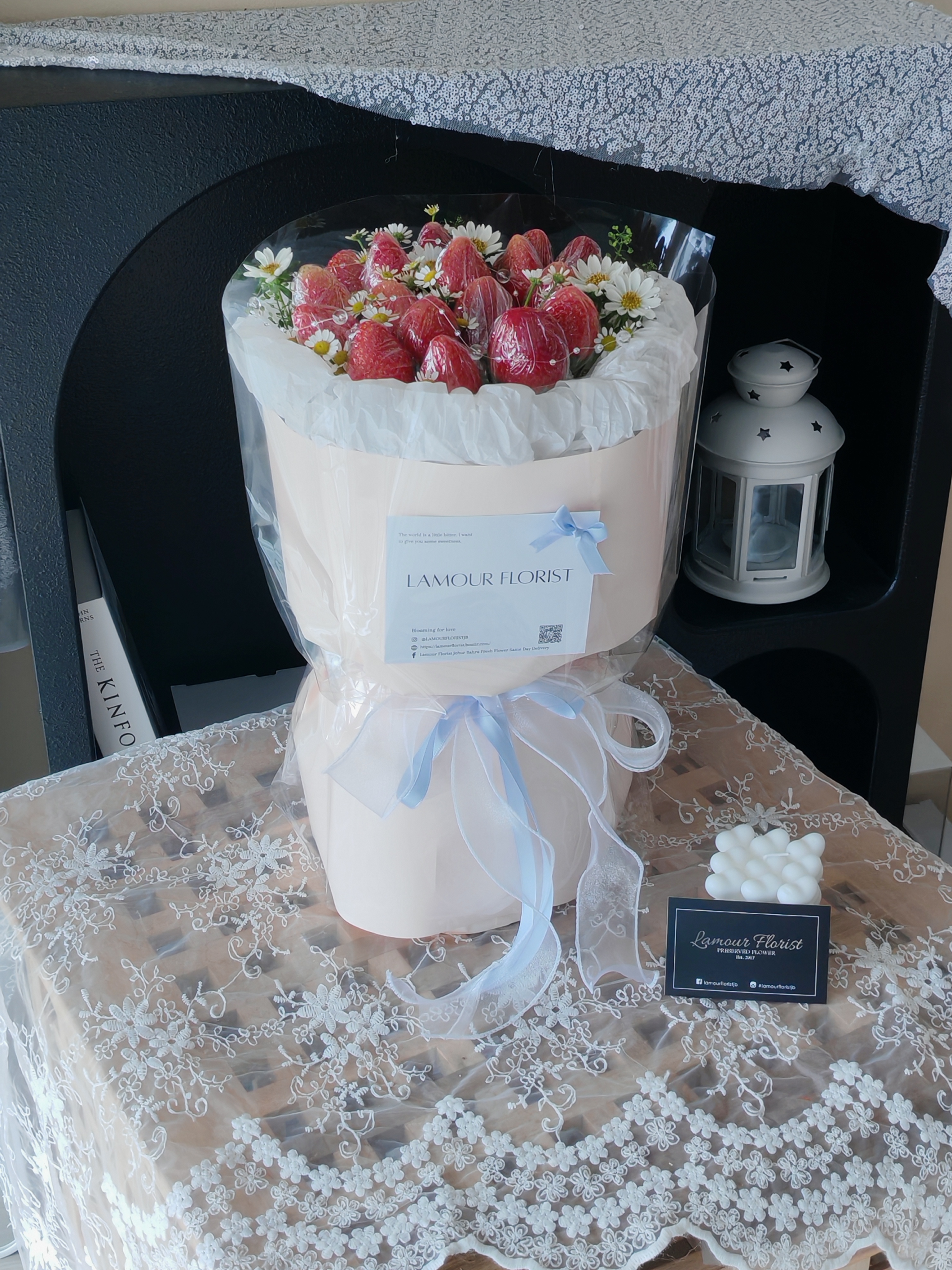 Fresh Strawberry import from oversea, filled with chamomile, hana and green leaf. PRODUCT SIZE Approx. 40cm x 25cm PRODUCT LIFESPAN 1-2 days, because Strawberry is fresh fruit please having it within a day upon received. DELIVERY Available for JB area delivery service, Same day delivery takes 3 - 4 hours to proceed the delivery. COMES WITH FREE PRINTED MESSAGES CARD.