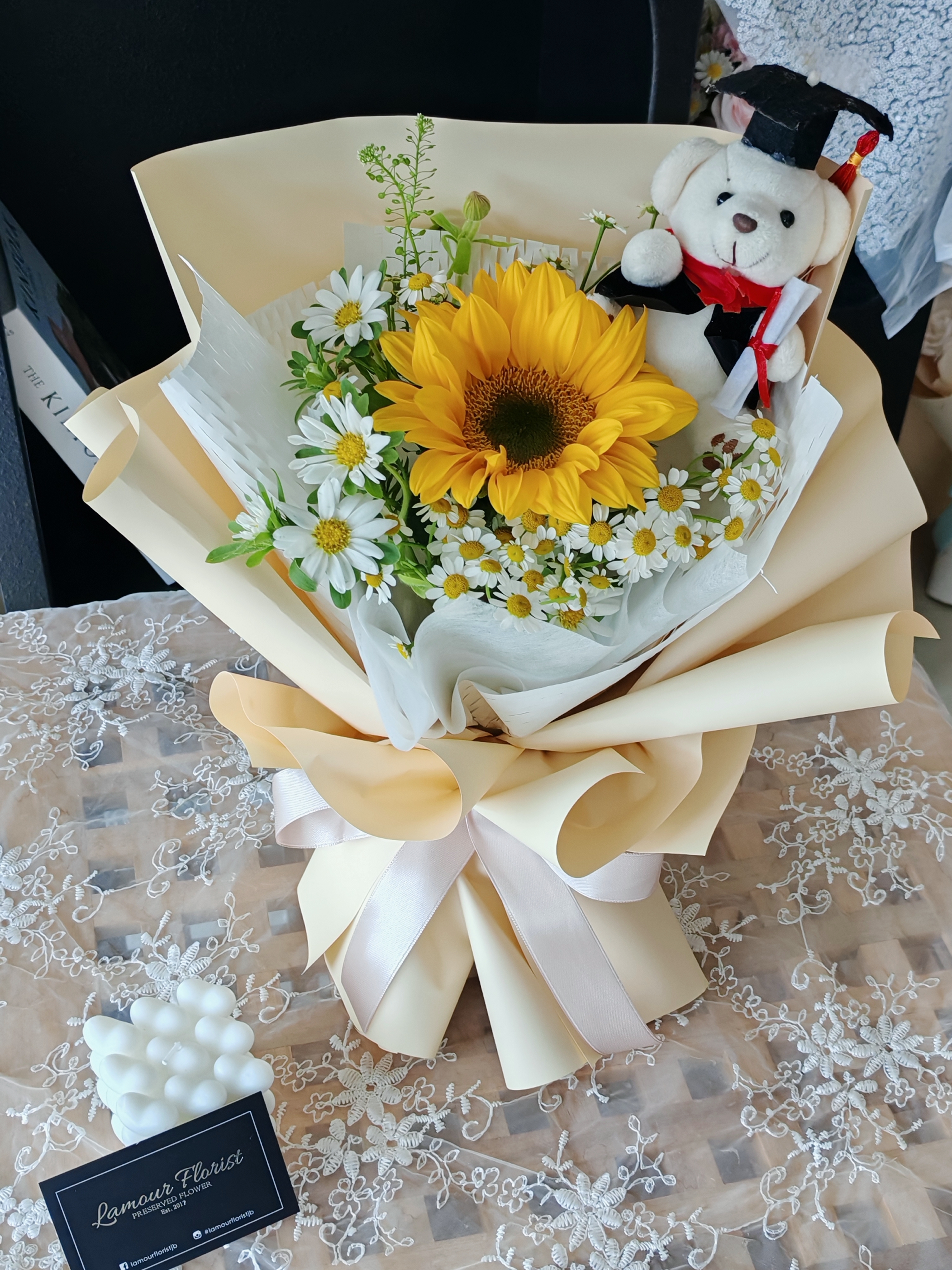 MAIN FLOWERS Import fresh Sunflower mixed with hana white and chamomile. PRODUCT LIFESPAN 2-3 days with proper care needed. SIZE Approx. 30cm X 22cm FREE PRINTED MESSAGES CARD.