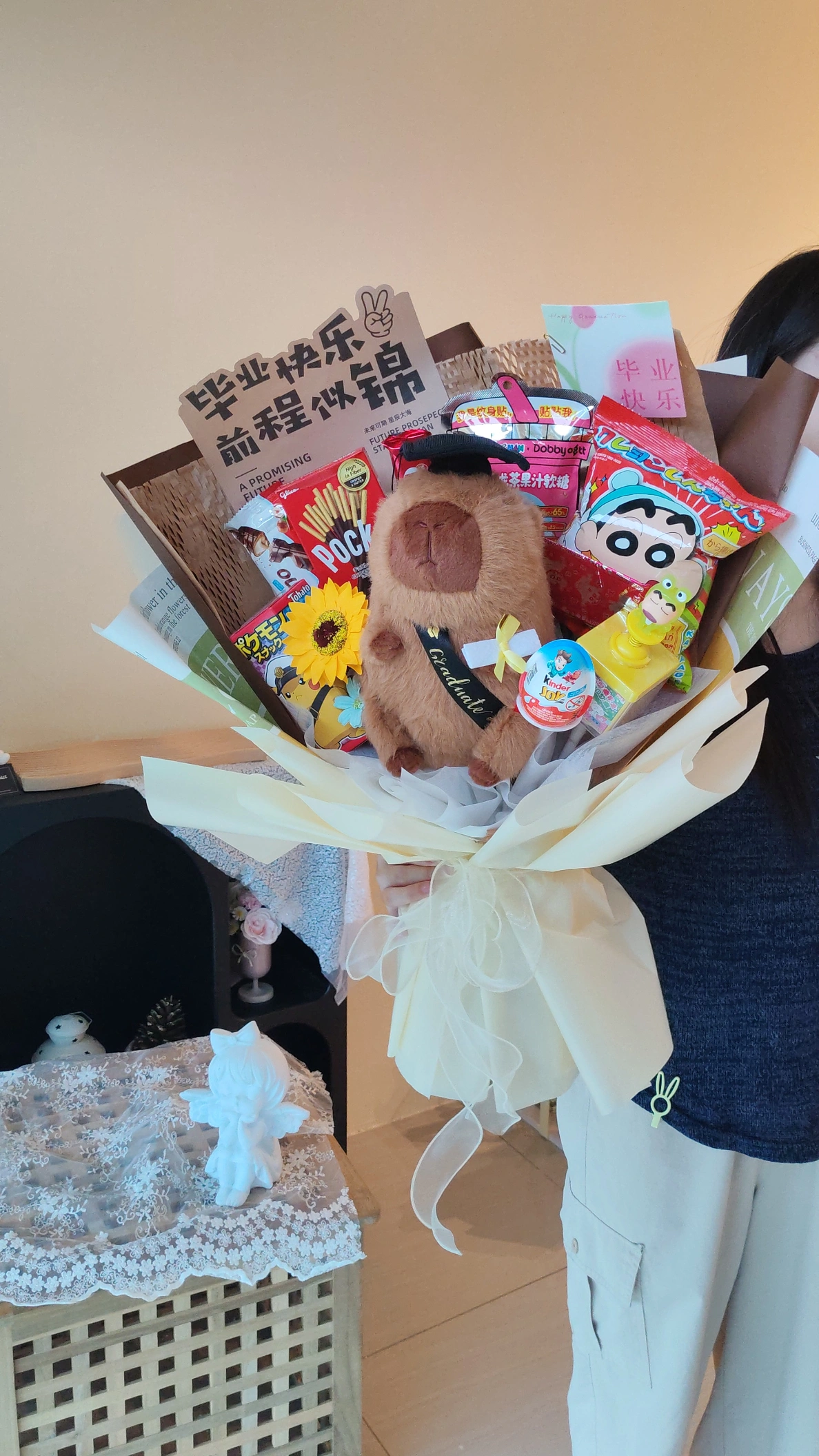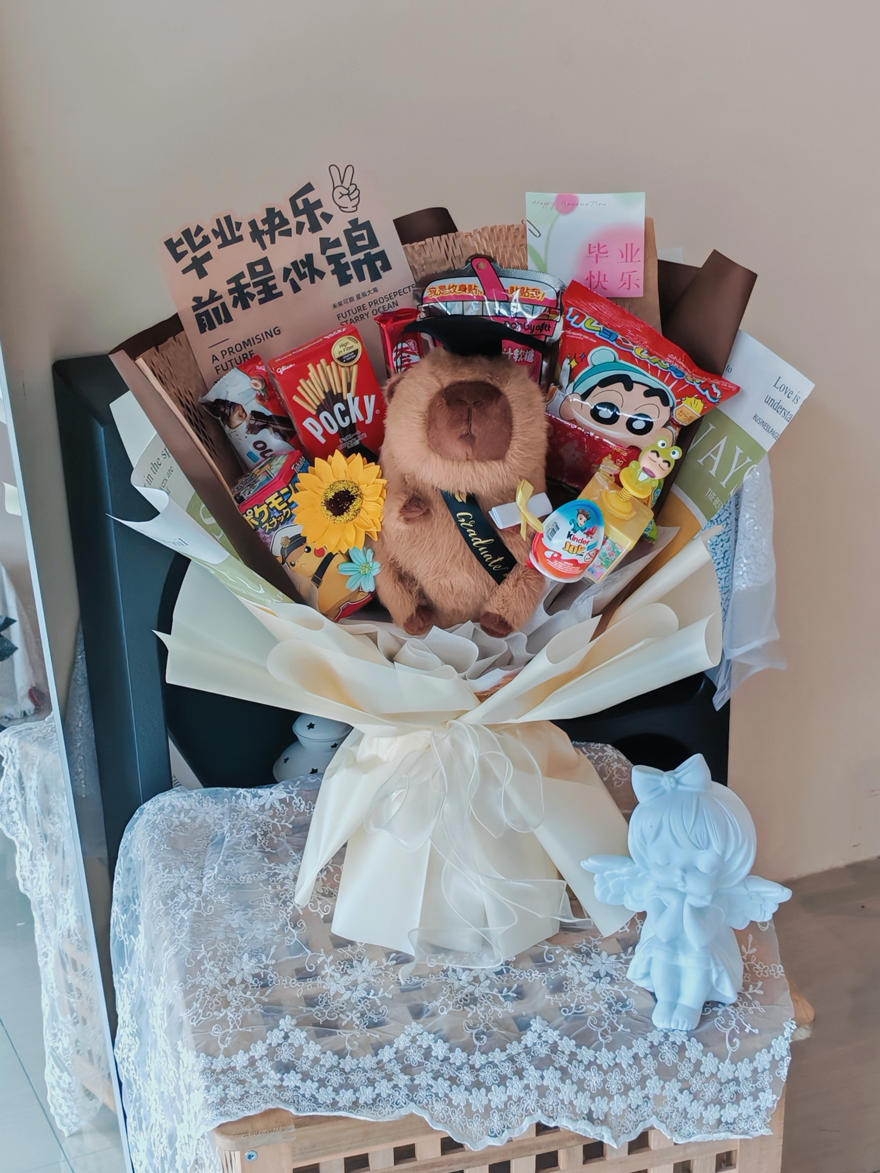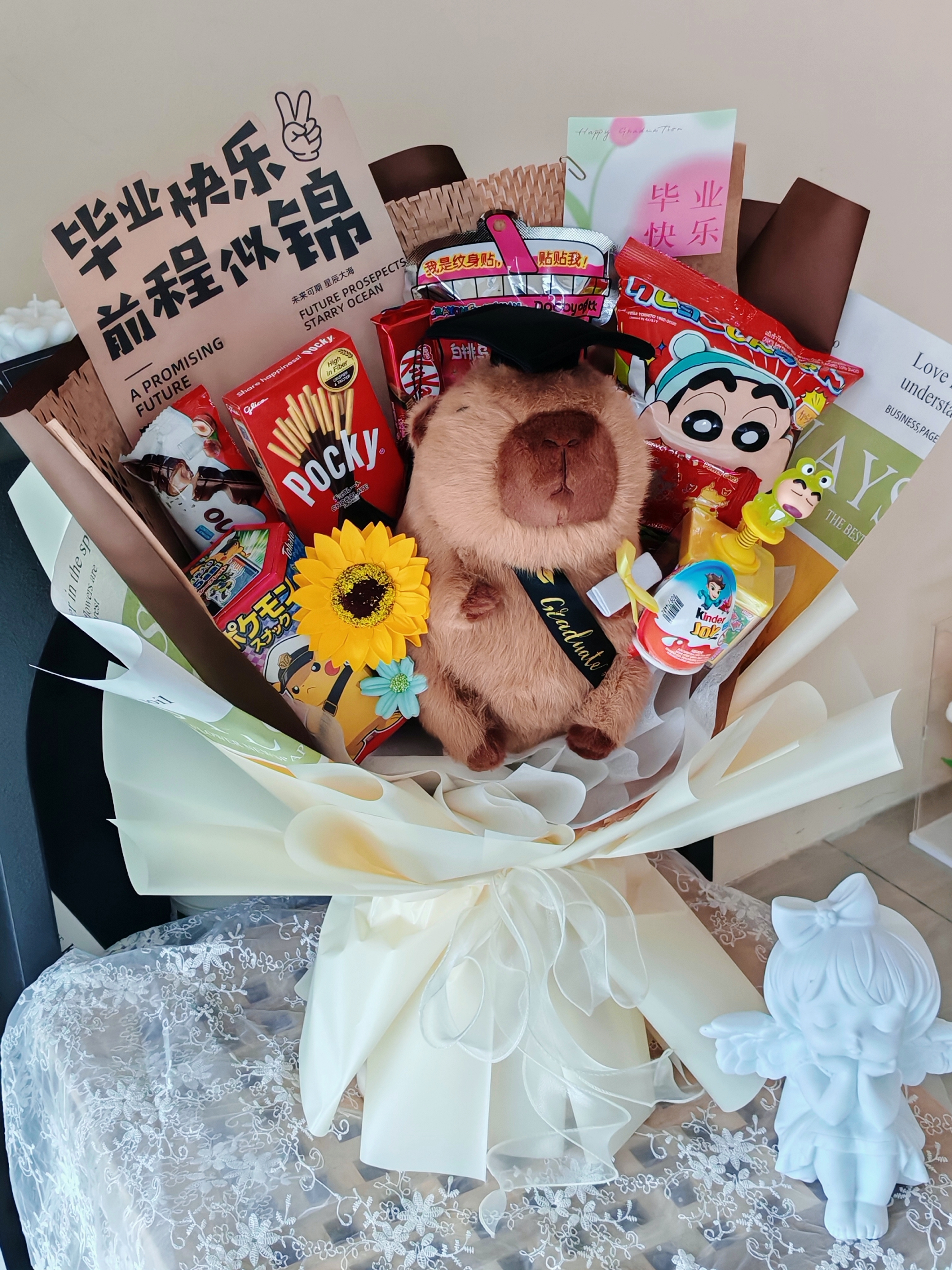 Large size snacks bouquet include chocolate, KitKat, Pocky, Kinder Bueno and Sin Chan snacks. SIZE Approx. 40cm x 40cm FREE greeting card with purchase