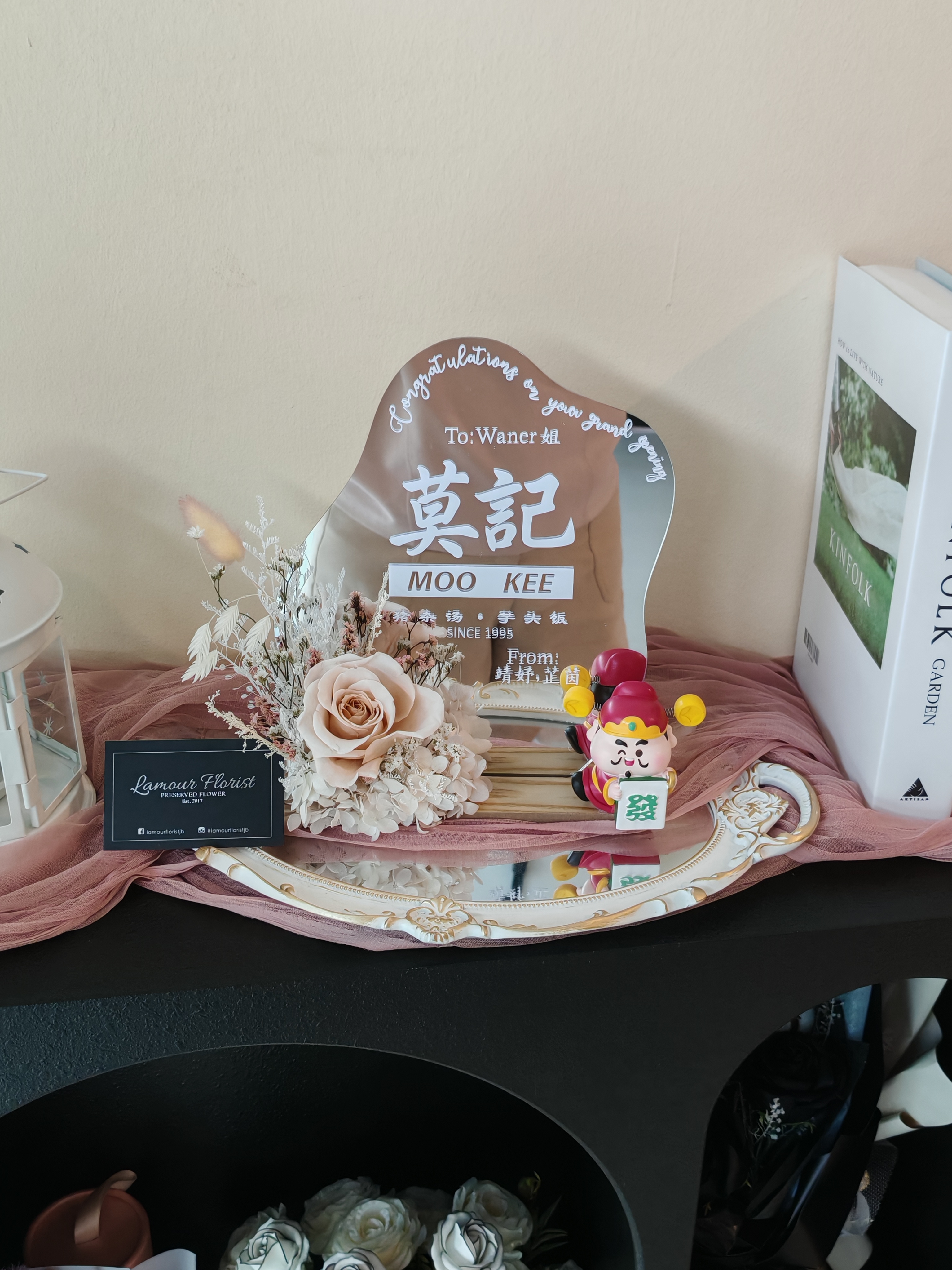 This preserved flowers mirror featuring Muji style preserved roses & fillers decorate with one unit Fortune God figurines. Size: 19*24cm Lifespan:2 years Include business logo and greeting design. WM postage fee included. Place order and discuss the details in WhatsApp: 60167316332 Ms Lim