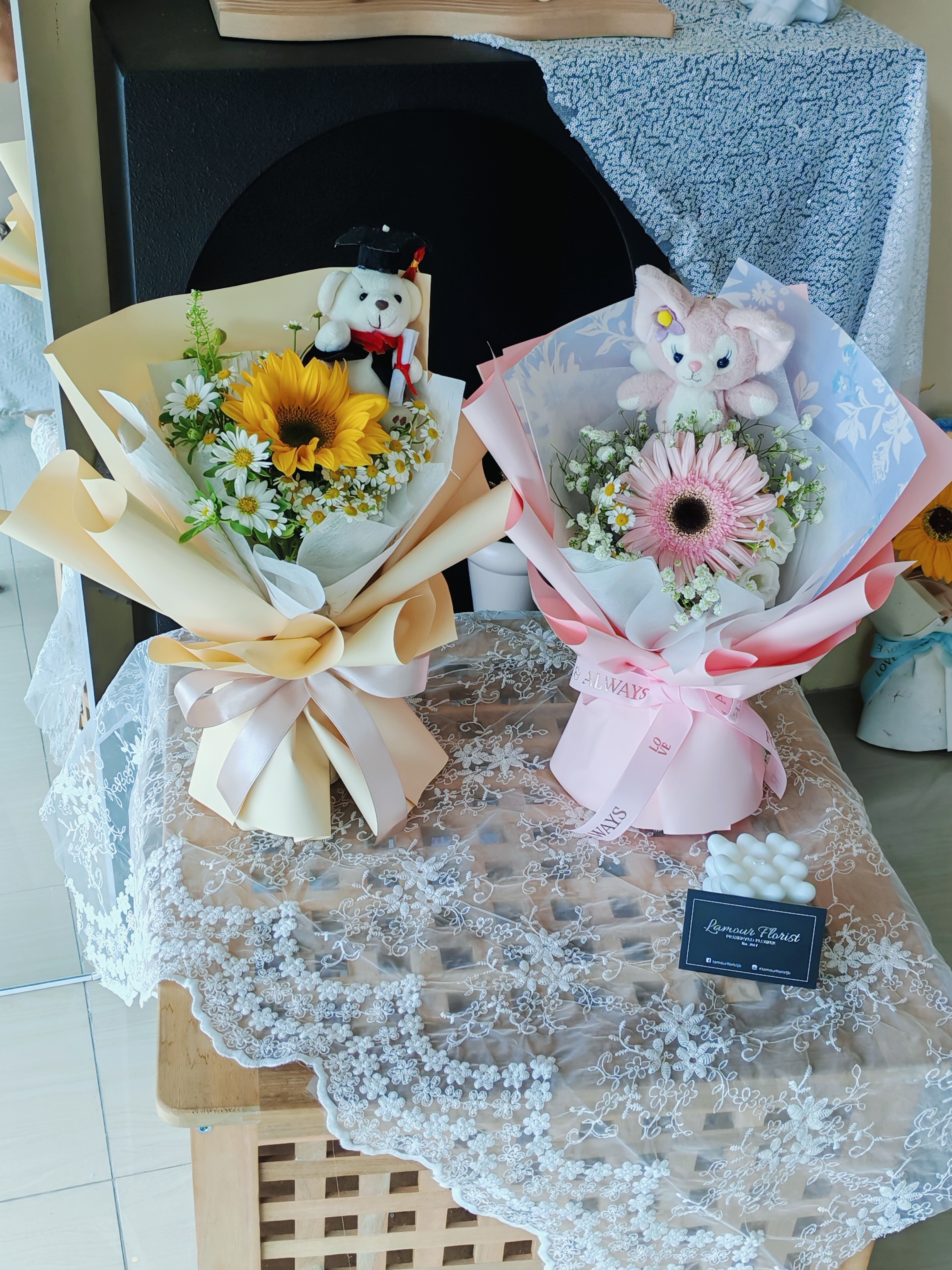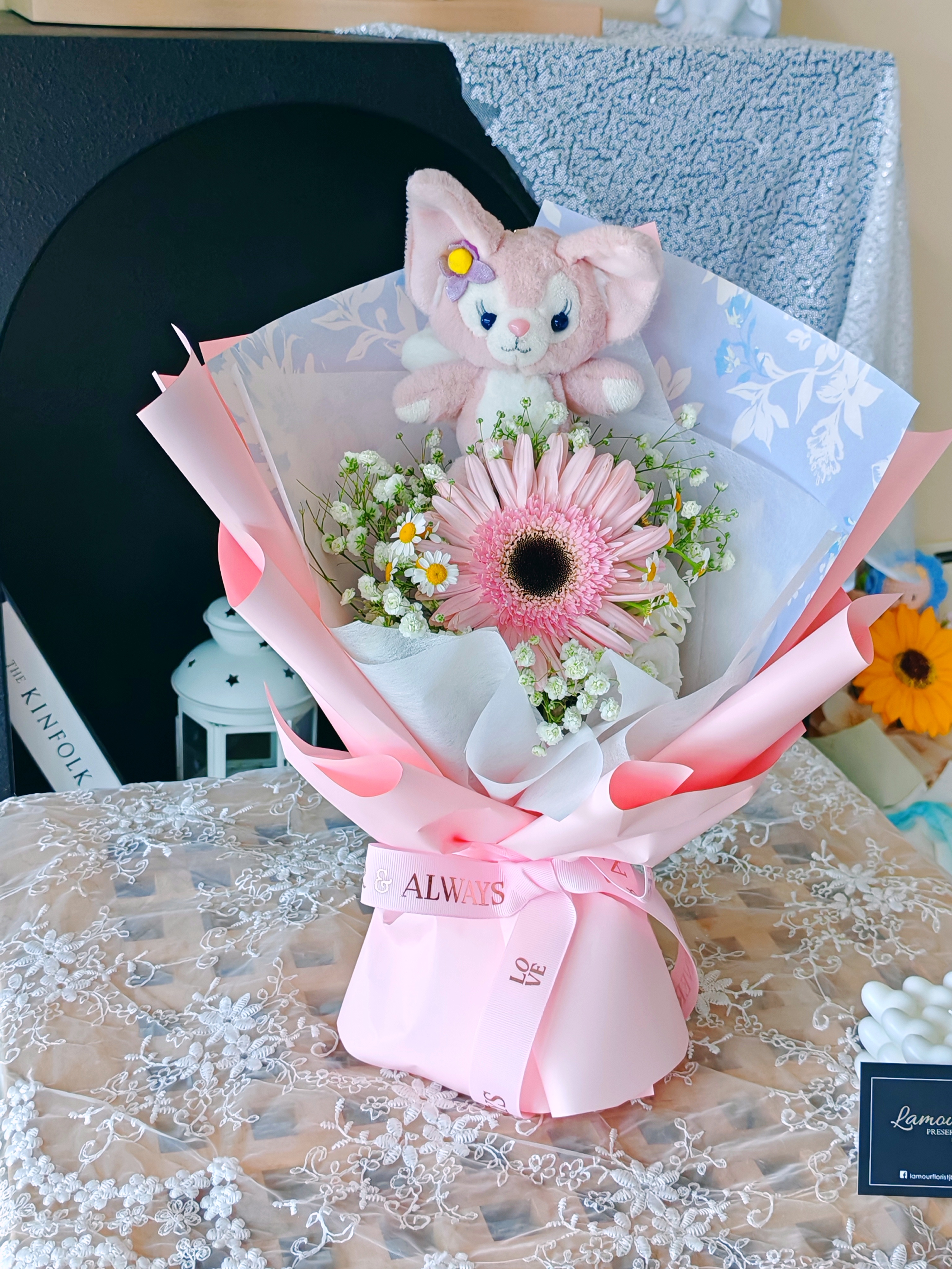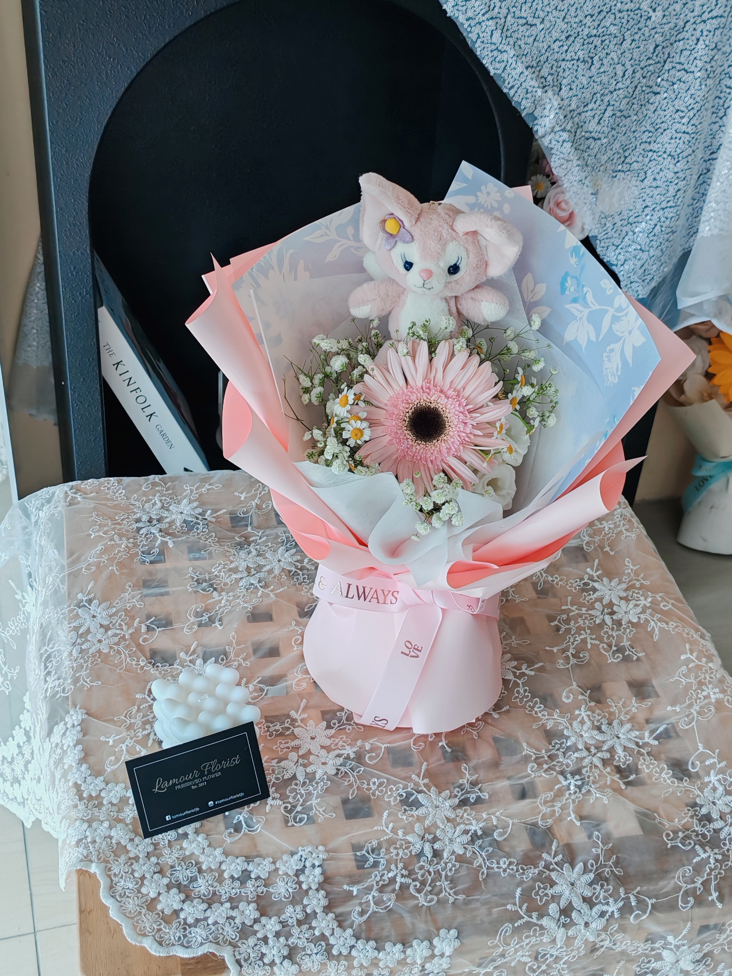 MAIN FLOWERS Gerbera Daisy, chamomile and filled with babybreath flowers. Include one Linabell Plushie Toy.