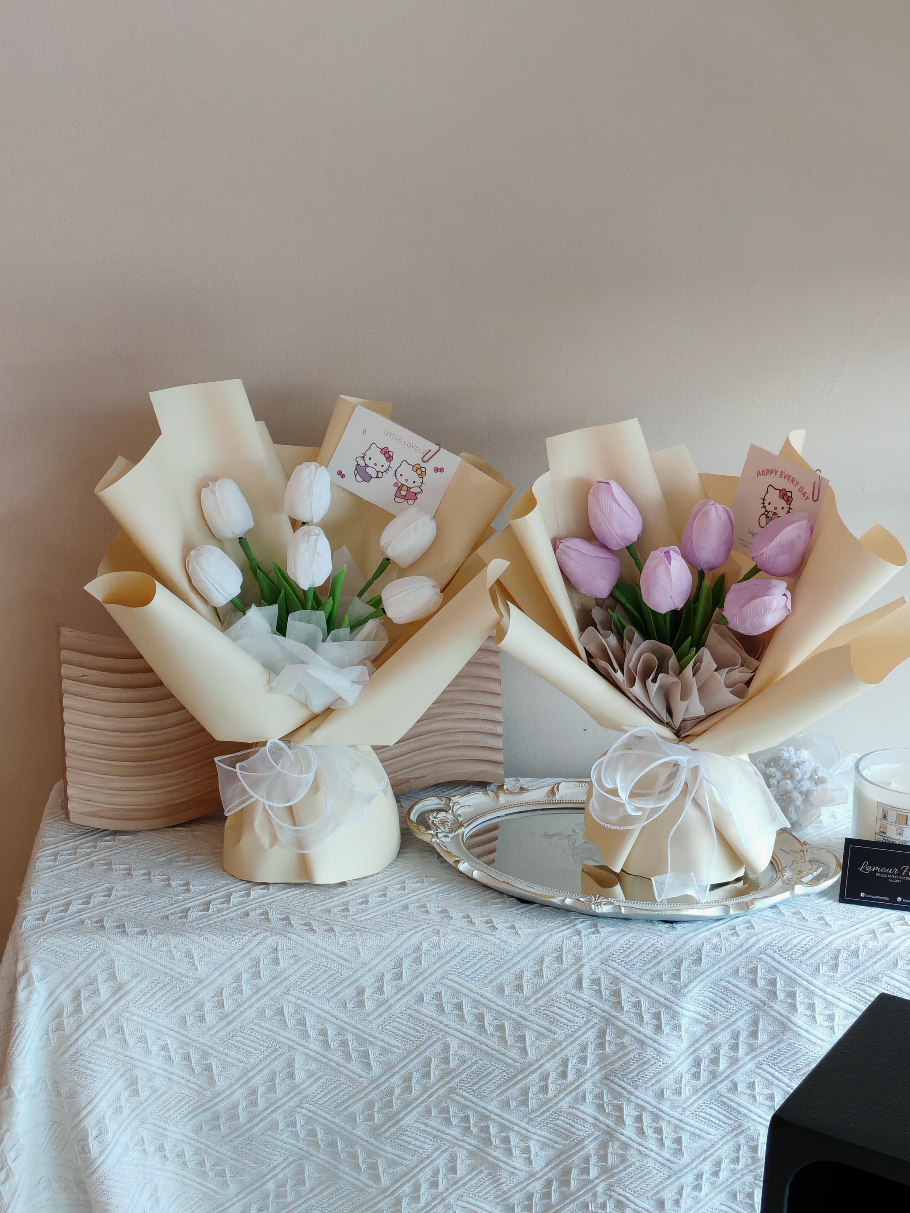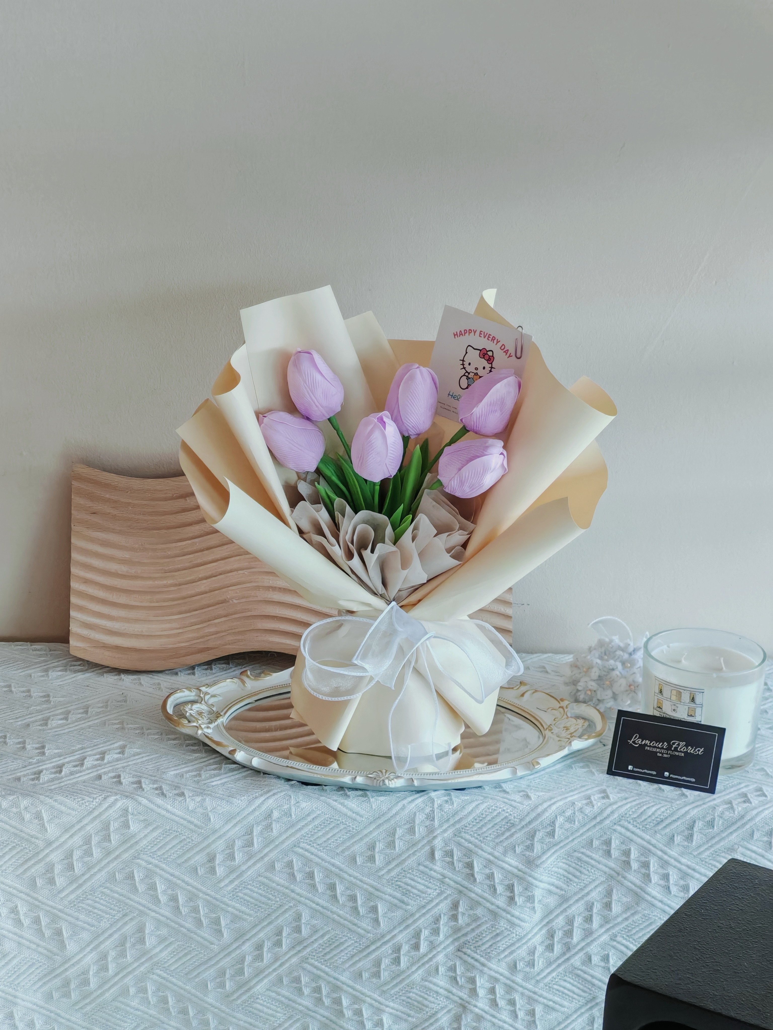 STEMS INCLUDED 6 Stalks tulips soapflowers. PRODUCT LIFESPAN 2 - 3 years with proper care needed. Store at area avoid direct sunlight exposure and keep away from humidity environment. SIZE Approx. 30cm X 28cm Free greeting card and transparent gift bag.