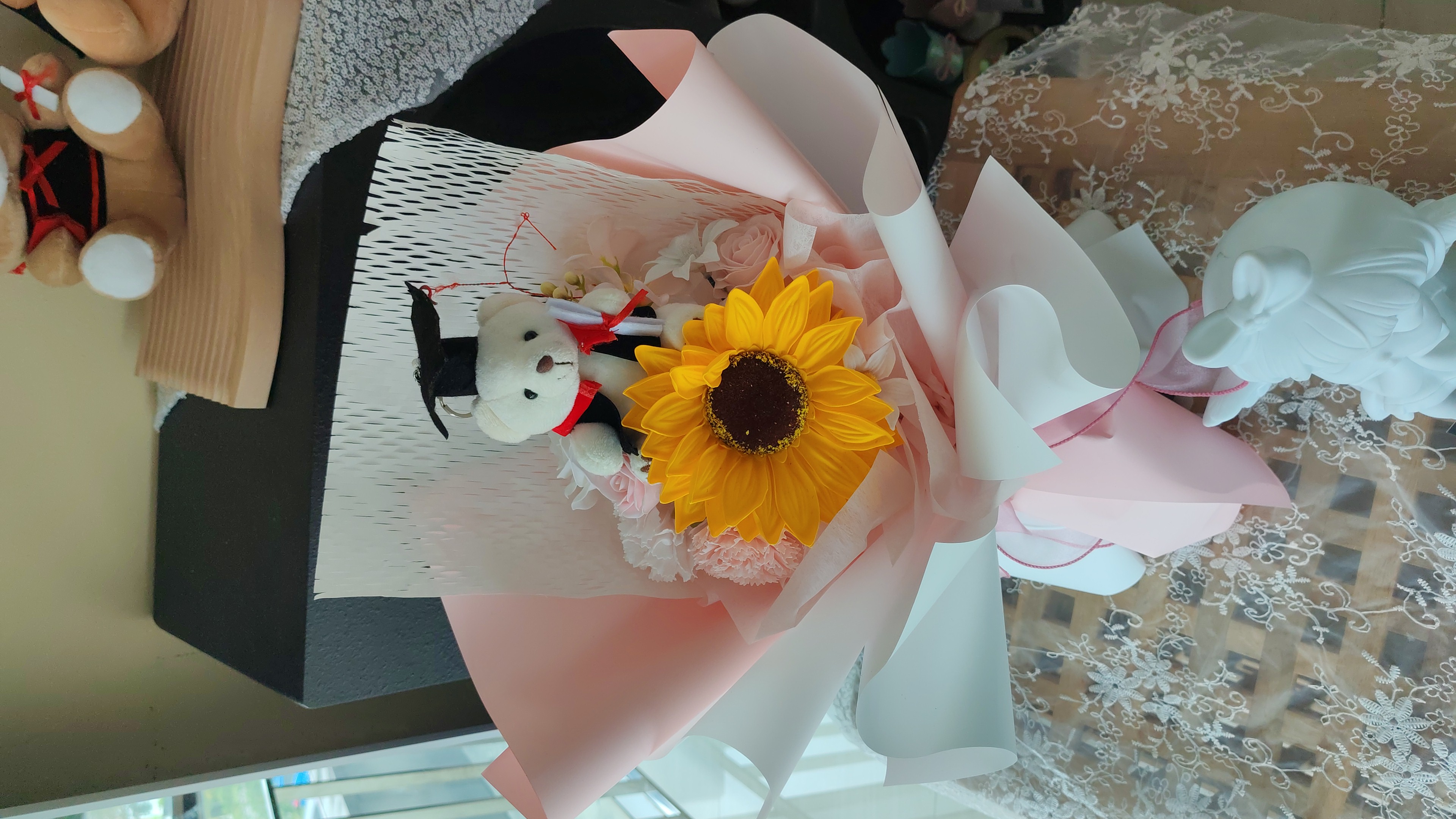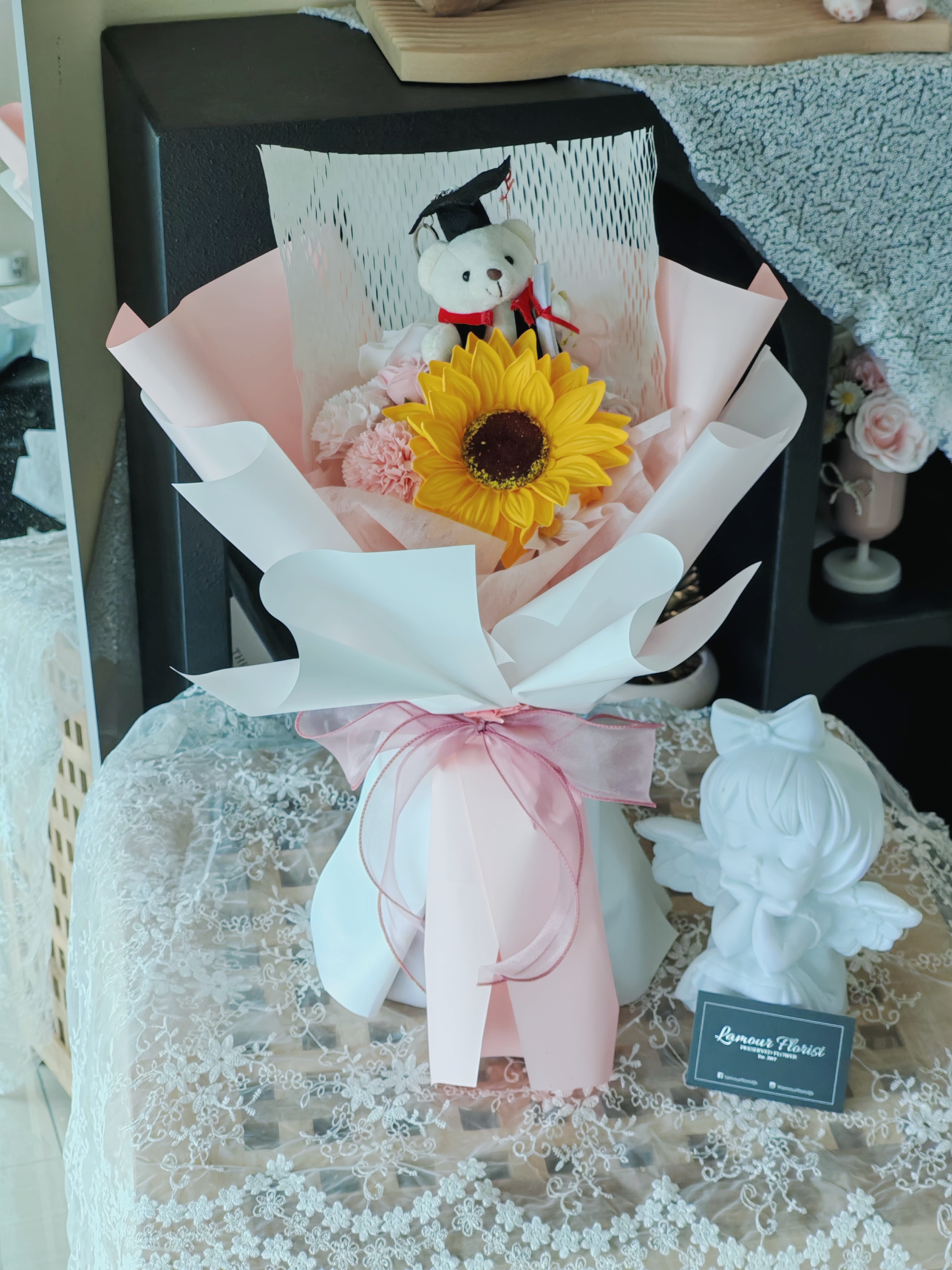 MAIN FLOWERS Mixed sunflower, mini carnation and rose soapflower bouquet with Graduation bear. SIZE Approx. 45cm X 32cm COMES WITH FREE PRINTED MESSAGES CARD.