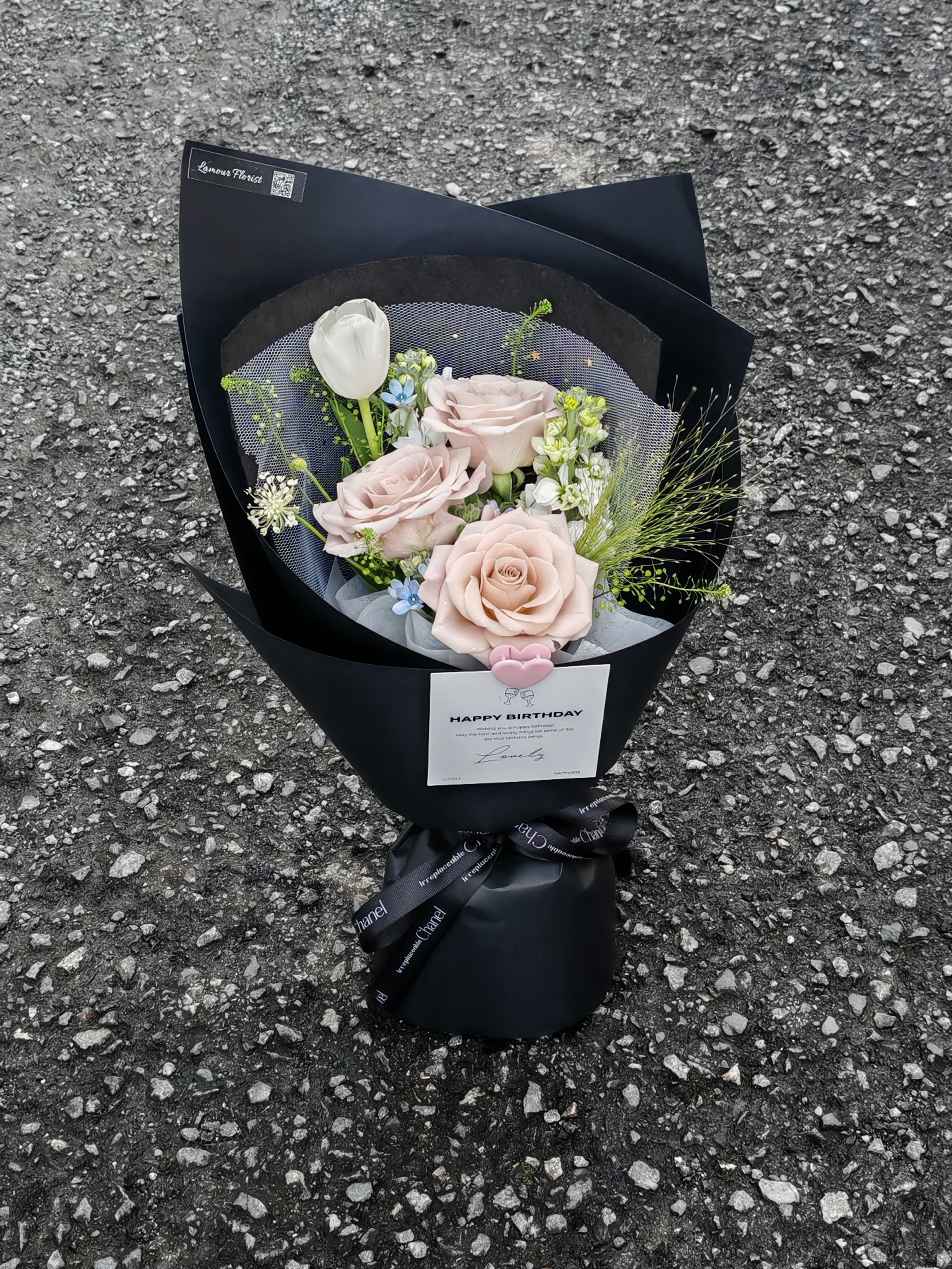 MAIN FLOWERS 3 stalks import Menta Roses, one stalk tulip, oxypetalum, panicum and thalaspi green bell. PRODUCT LIFESPAN 2-3 days with proper care. SIZE Approx. 40cm X 22cm FREE PRINTED MESSAGES CARD.