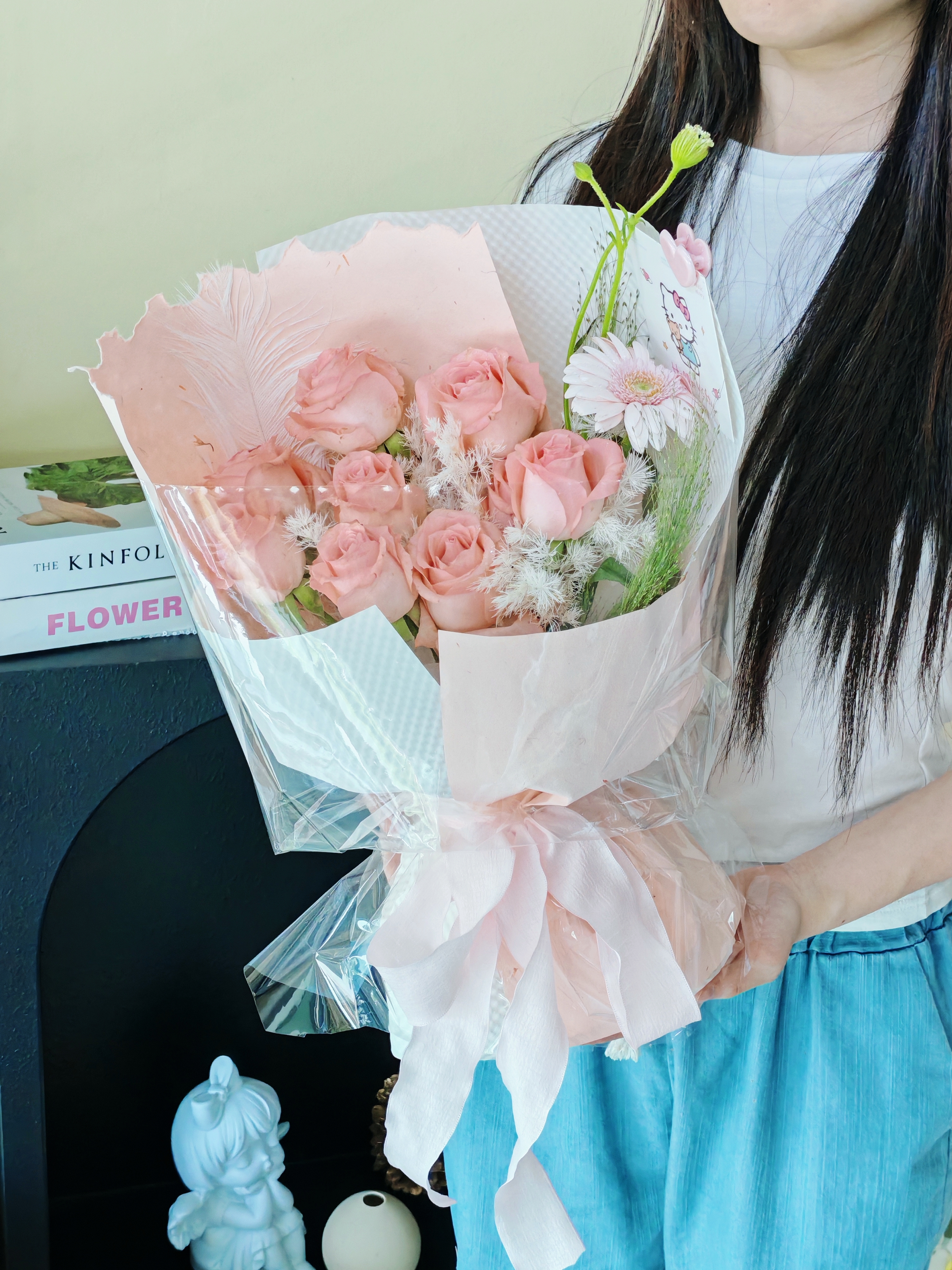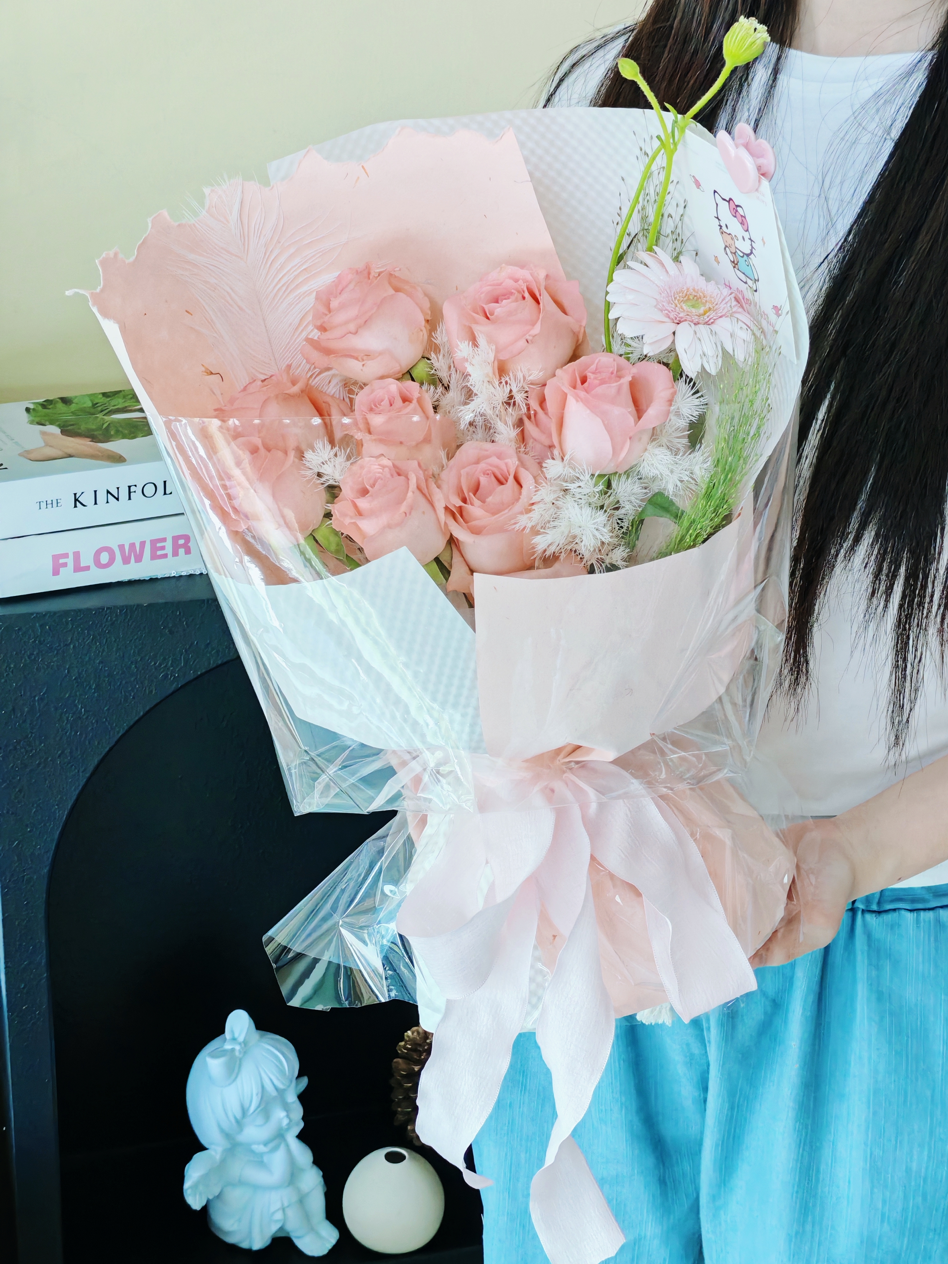 STEMS INCLUDED Import fresh roses Diana 8-9 stalks, Gerbera, white preserved Asparagus, Tracymene and feather. PRODUCT LIFESPAN 2 - 4 days with proper care needed. SIZE Approx. 30cm X 40cm FREE PRINTED MESSAGES CARD AND AND TRANSPARENT GIFT BAG.