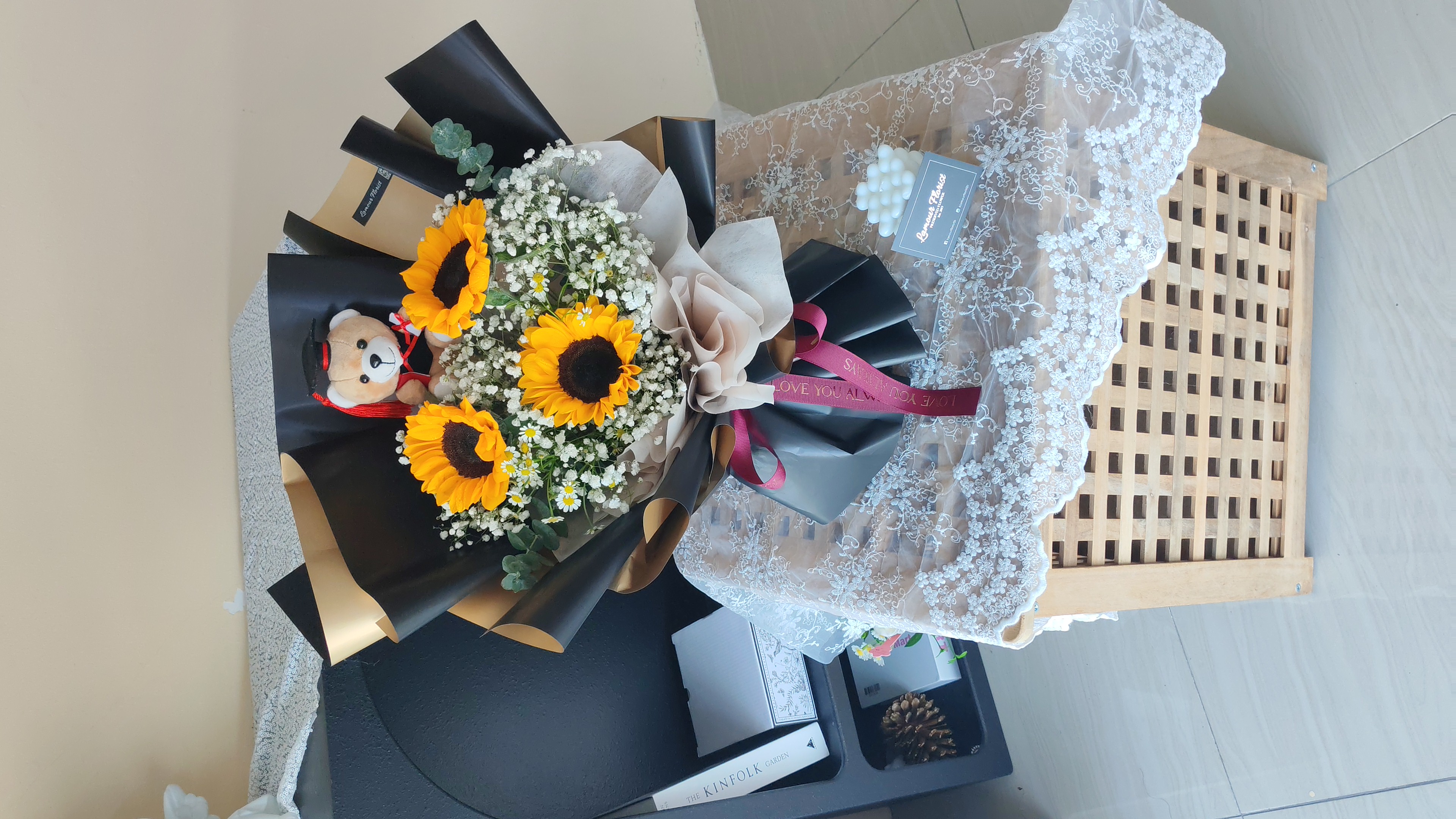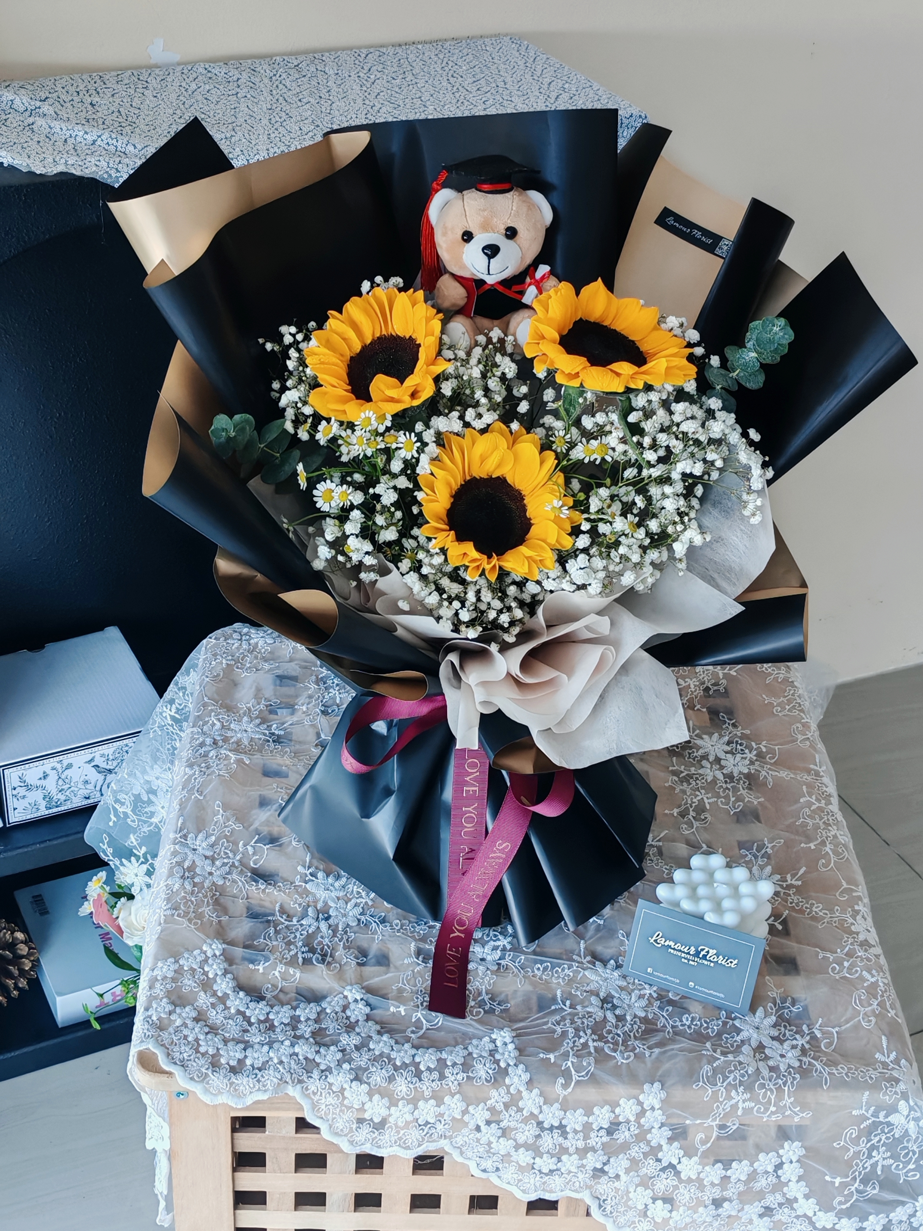 MAIN FLOWERS 3 stalks Sunflowers, mixed with white babybreath, chamomile and eucalyptus leaf. PRODUCT SIZE Approx. 40cm*48cm PRODUCT LIFESPAN 2-3 days with good care. DELIVERY JB area delivery service available. COMES WITH Free printed greeting card.
