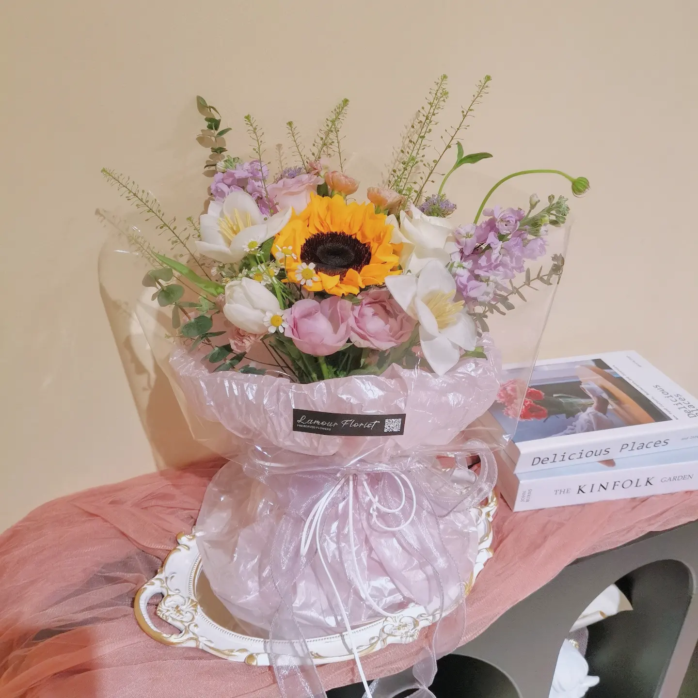 Featuring fresh flowers: 3 stalks white tulip, 1 stalk sunflower, 2 pink avalanche rose, chamomile, Hana, thlaspi green bell, purple mathitiola and filled with eucalyptus leaf. Size:Approx. 35*49cm Important note* All our products, including but not limited to flowers, wrappers and ribbon are subject to availability. In the event if you order the product from our Facebook, Instagram and website is not available we shall substitute the any of the product to an alternate product of equal or higher value depending on the availability. We will ensure the design style, colours of your order is preserved. JB area include delivery fee. Free greeting card available.