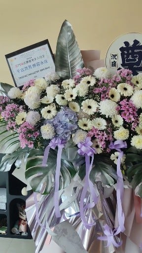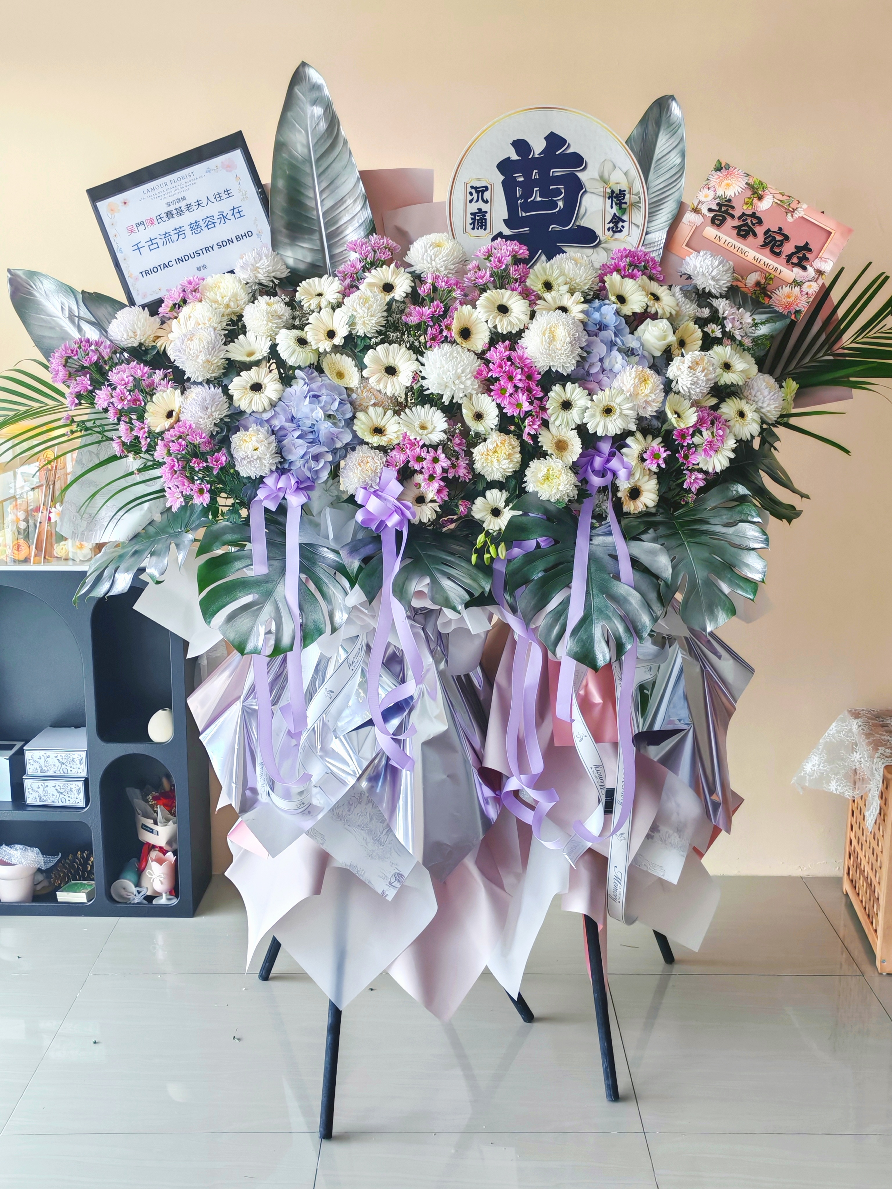 MAIN FLOWERS Gerbera, Blue Hydrangea, Taiwan Mum Chrysanthemum, Pom Pom, Dendrobrium orchid, Bird of paradise leaf, Yellow palm leaf, Peacock and Monstera. SAME DAY DELIVERY FOR JB AREA FOR ORDER PLACED BEFORE 3PM AFTER 3PM WILL PROCEED DELIVERY ON NEXT DAY. DELIVERY AREA COVER Nirvana Memorial Center, Tiong Hua Memorial Park and all JB areas. .