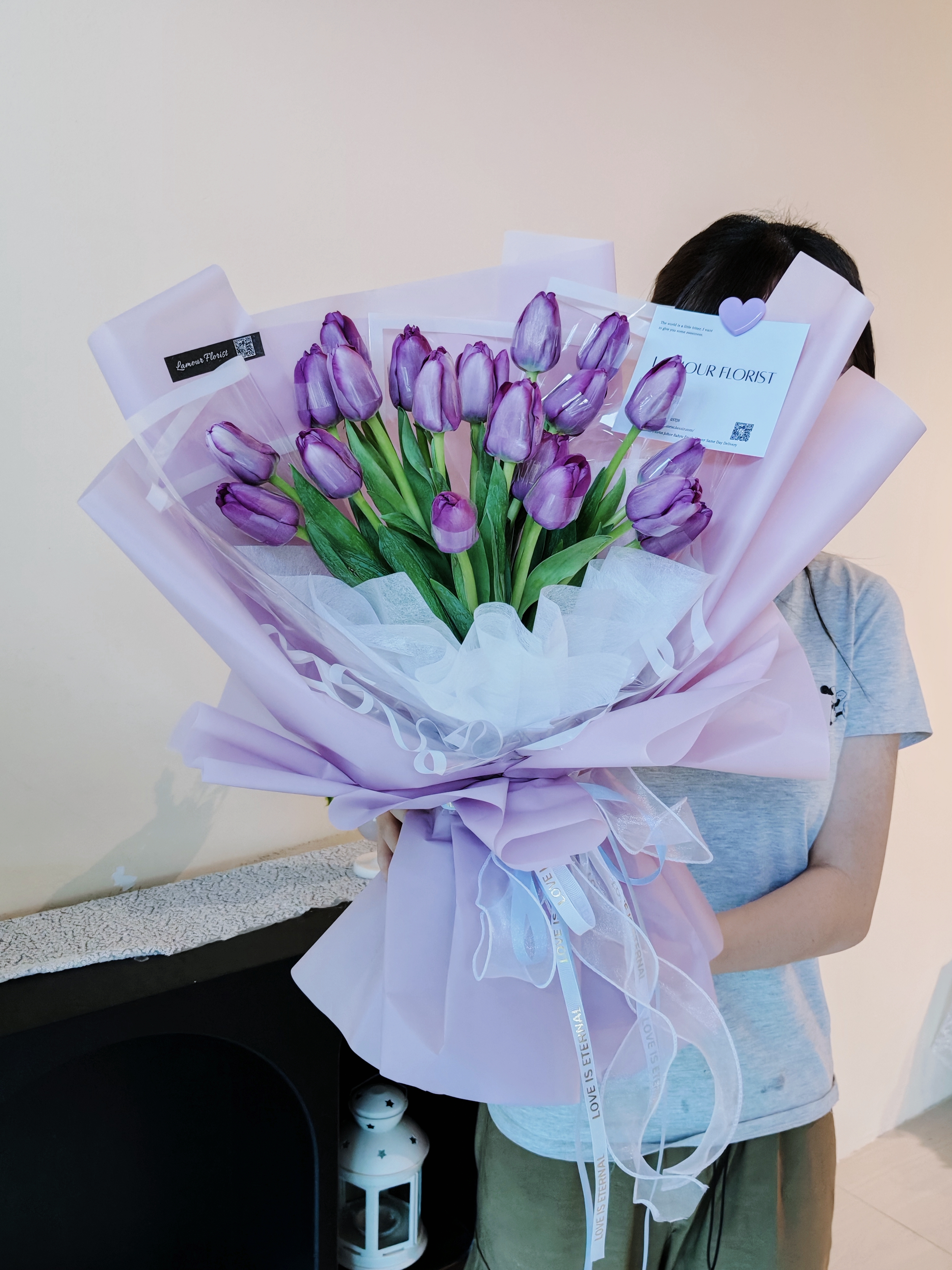 MAIN FLOWERS Import fresh Purple Tulips 18 - 20 stems. SIZE APPROX. 50CM *52CM PRODUCT LIFESPAN 1-3 days with proper care needed. DELIVERY Only available for JB area delivery service.