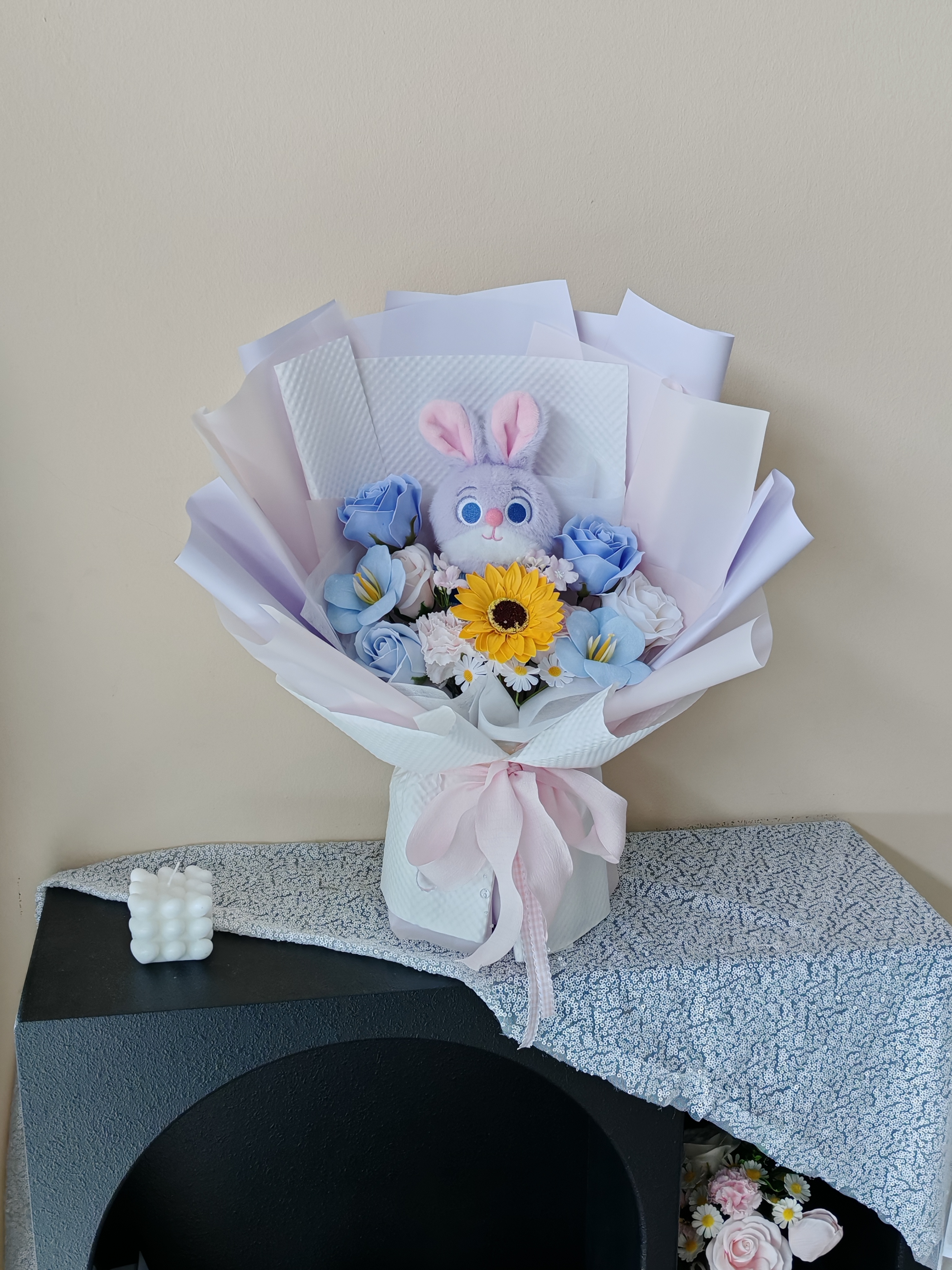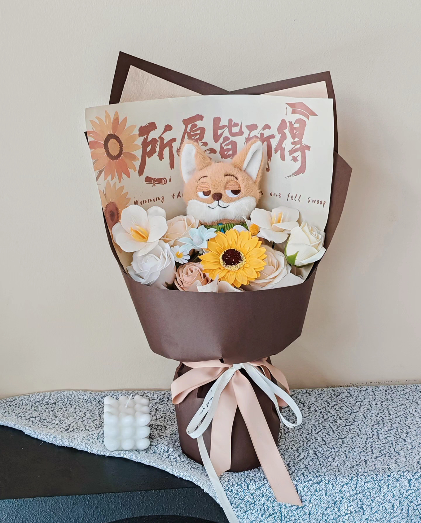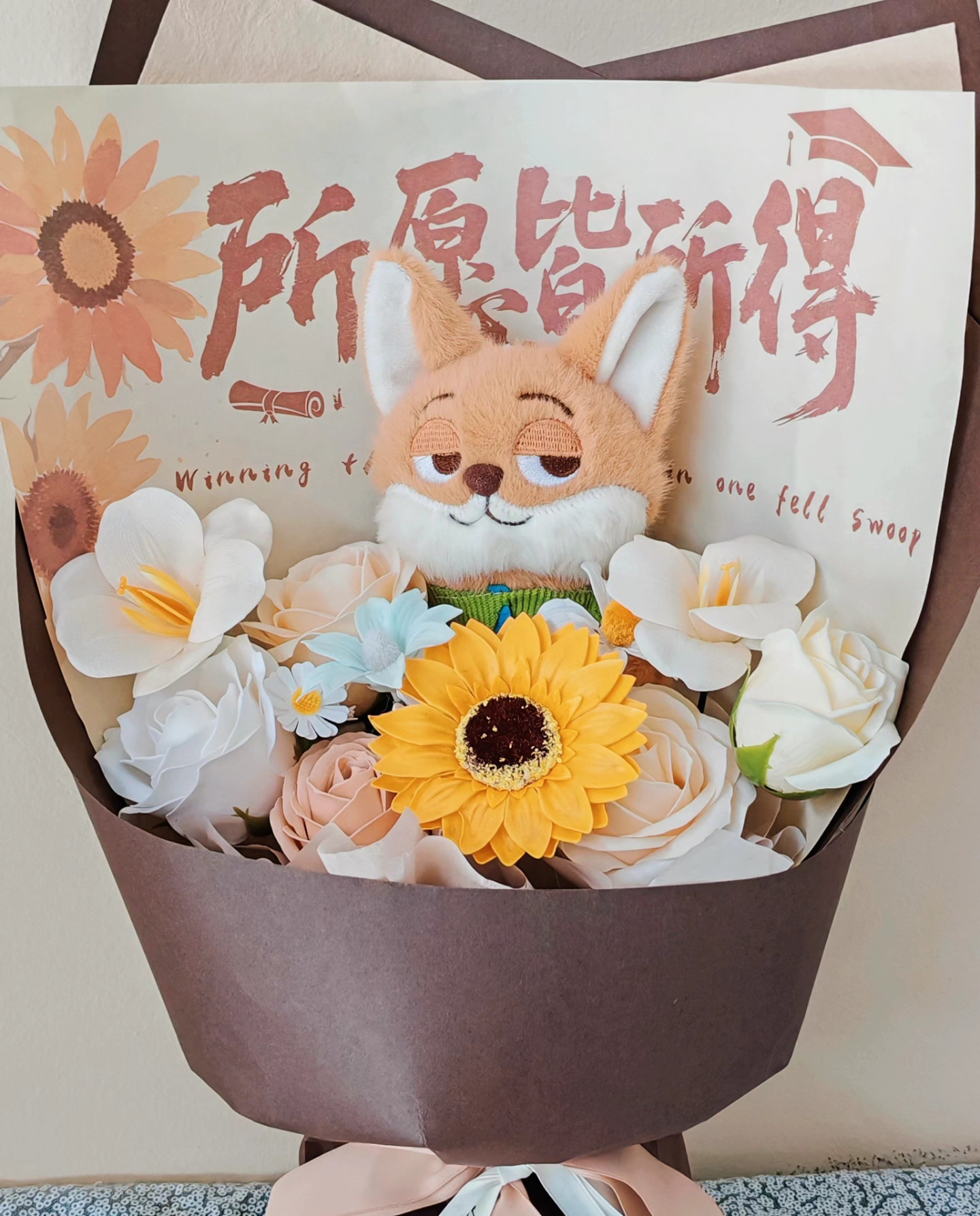 MAIN FLOWERS Scented soap flowers with Zootopia Plushie Toys: Nick and Judy Please select the variant you want. 1 Bouquet per item ordered. SIZE Nick - Approx. 30cm X 42cm Judy - Approx. 35cm X 43cm